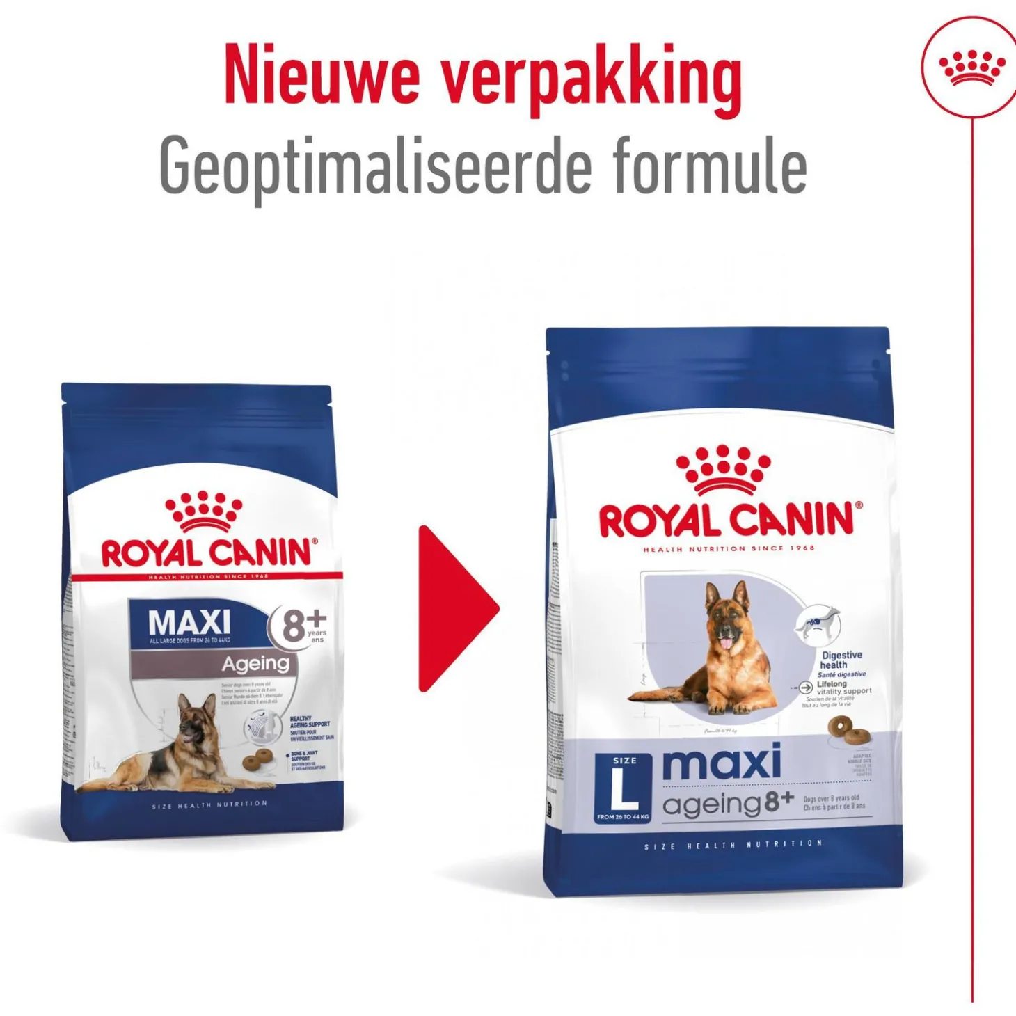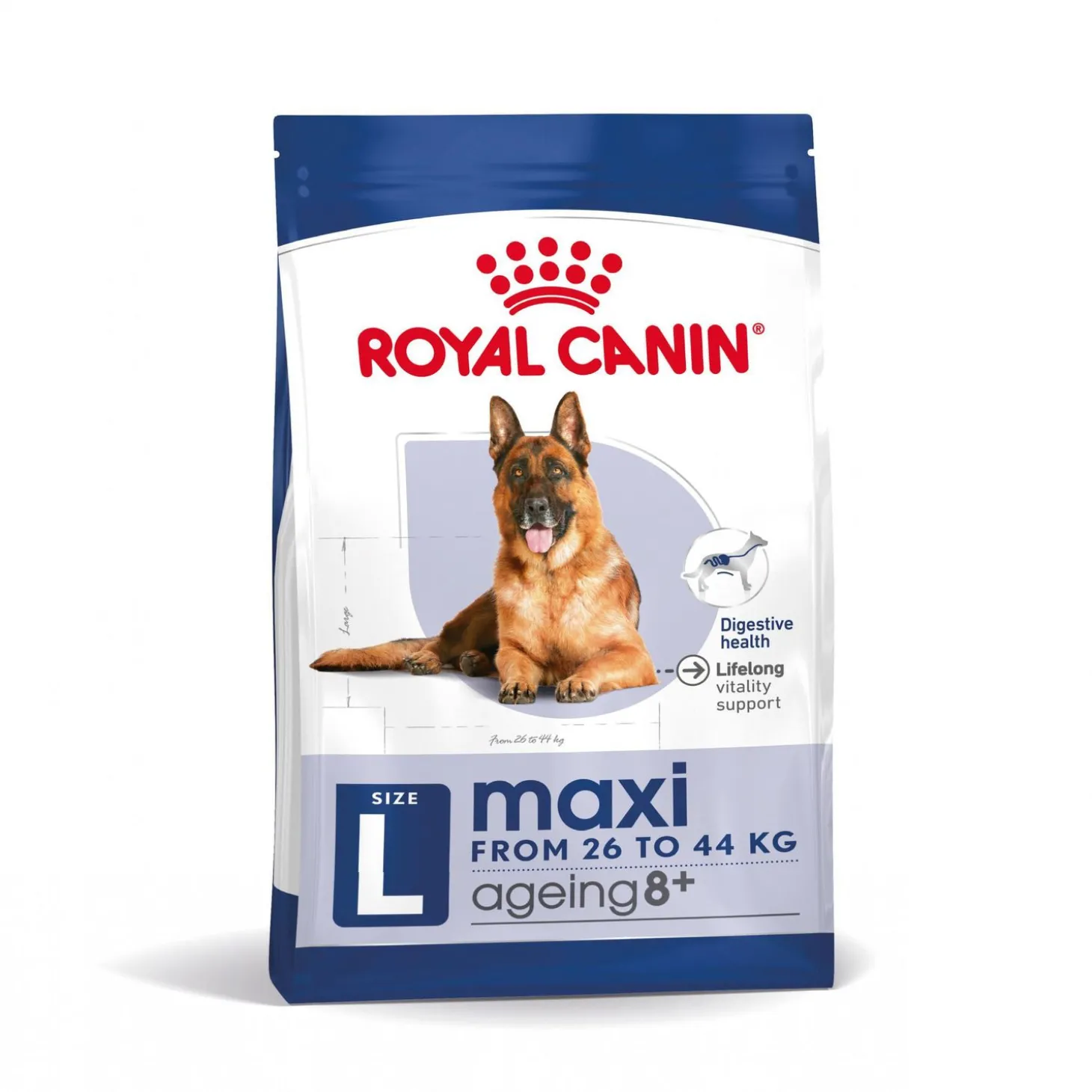 Royal Canin Maxi Ageing 8+ is samengesteld met de voedingsbehoeften van je oudere hond in het achterhoofd en is geschikt voor grote honden van 8 jaar en ouder, met een volwassen gewicht van 26 tot 44 kilogram.