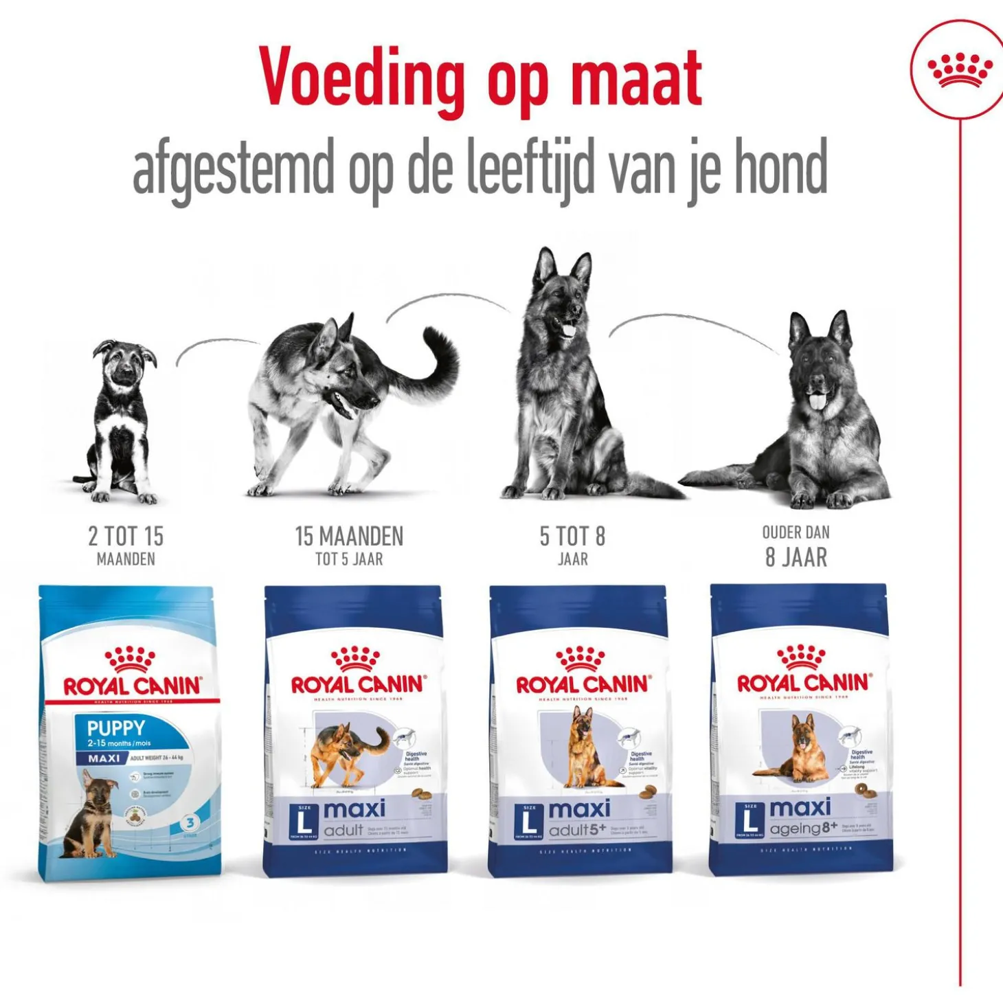 Sinds hij volwassen is, heeft de gezondheid van jouw grote hond vele veranderingen ondergaan en de eerste tekenen van veroudering kunnen zichtbaar worden. Het is belangrijk voor ogen te houden dat in elke fase tijdens het leven van je hond een uitgebalanceerde voeding belangrijk is ter ondersteuning van zijn gezondheid, zoals Maxi Ageing 8+ van Royal Canin.