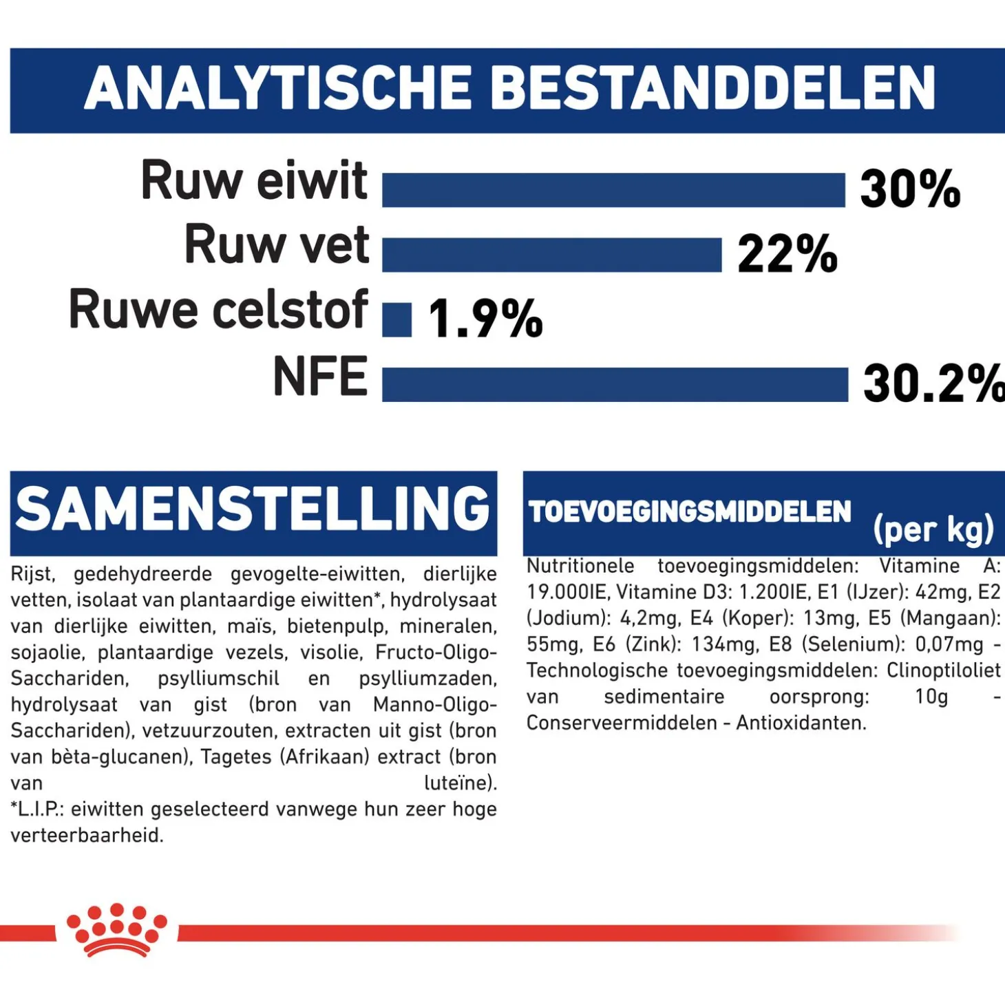 | Samenstelling | Rijst, gedehydreerde gevogelte-eiwitten, dierlijke vetten, tarwegluten*, maïs, gehydrolyseerde dierlijke eiwitten, mineralen, bietenpulp, sojaolie, plantaardige vezels, visolie, psylliumschil en psylliumzaden, fructo-oligosacchariden, gehydrolyseerd gist (bron van manno-oligosacchariden en bèta-glucanen) (0,30%), algenolie Schizochytrium sp. (bron van DHA), zout van boterzuur, tagetes meel. |