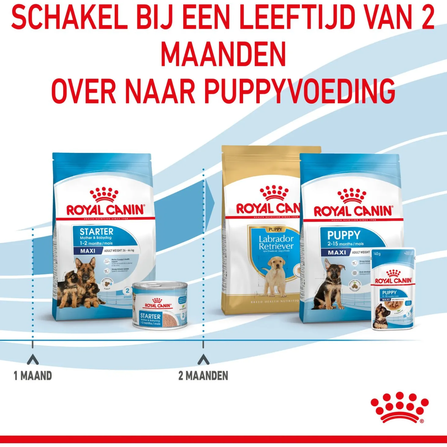 Royal Canin Maxi Starter Mother & Babydog is speciaal ontwikkeld met de voedingsbehoeften van een pups en moederhonden van een groot ras (26 tot 44 kg wanneer volwassen) in het achterhoofd. De brokken zijn geschikt voor puppy’s vanaf het spenen tot 2 maanden oud en hun volwassen moederhond.