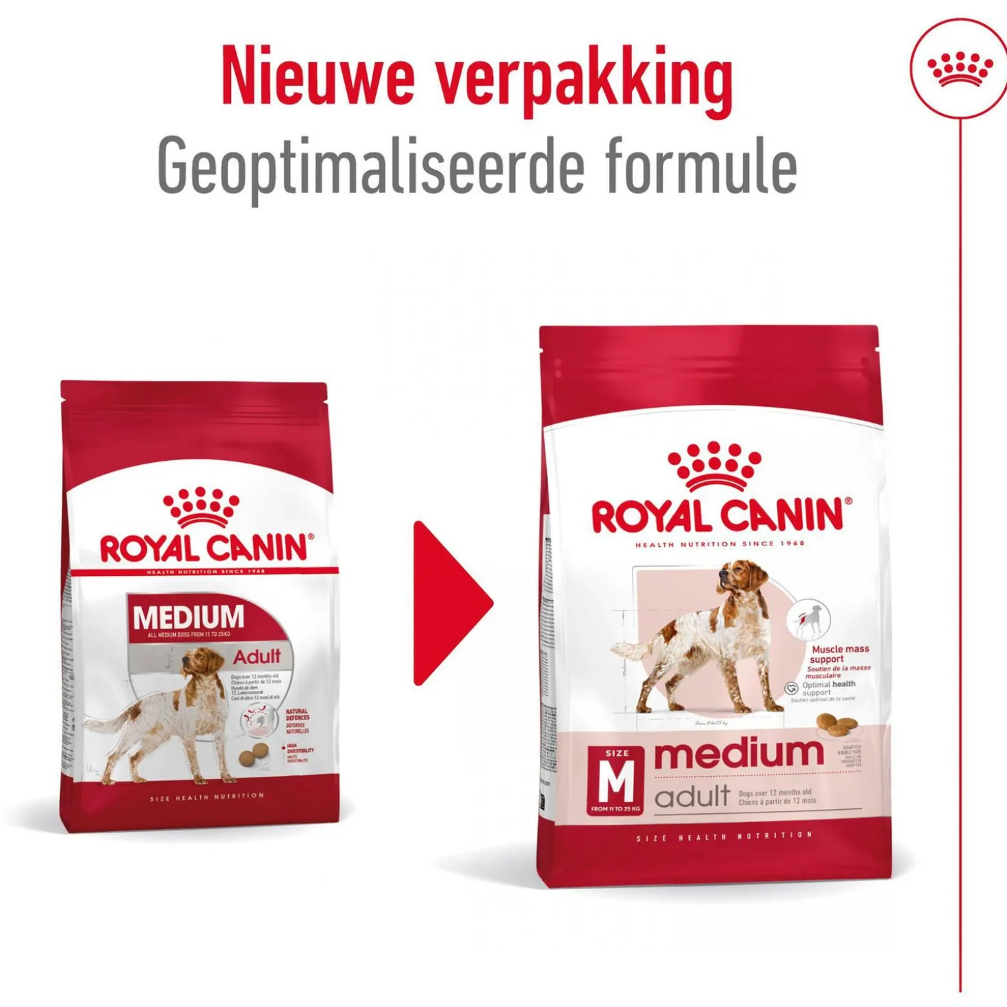 Royal Canin Medium Adult is verkrijgbaar in4 kg, 10 kg en 15 kg.