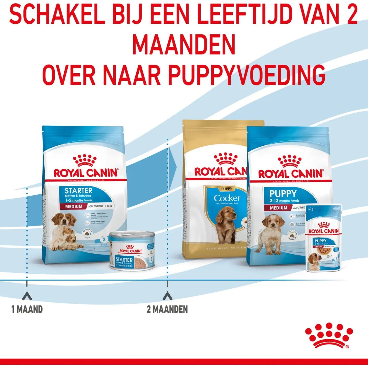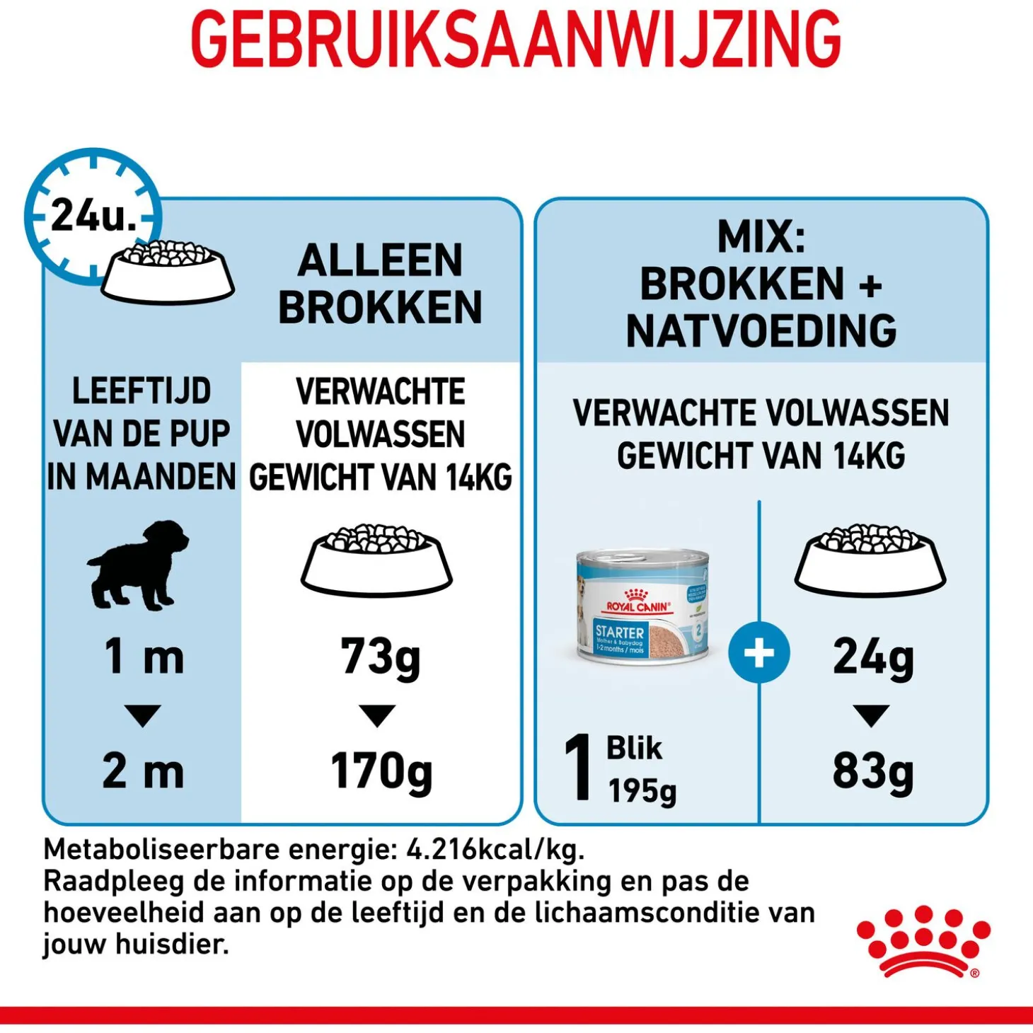 Royal Canin Medium Starter Mother & Babydog is speciaal ontwikkeld met de voedingsbehoeften van een pups en moederhonden van een middelgroot ras (10 tot 25 kg wanneer volwassen) in het achterhoofd. De brokken zijn geschikt voor puppy’s vanaf het spenen tot 2 maanden oud en hun volwassen moederhond.
