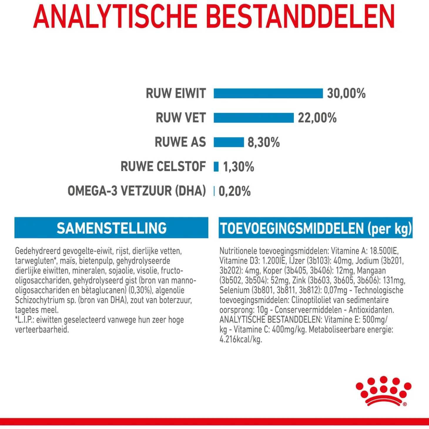 | Samenstelling | Gedehydreerde gevogelte-eiwitten, rijst, dierlijke vetten, tarwegluten*, maïs, bietenpulp, gehydrolyseerde dierlijke eiwitten, mineralen, sojaolie, visolie, fructo-oligosacchariden, gehydrolyseerd gist (bron van manno-oligosacchariden en bèta-glucanen) (0,30%), algenolie Schizochytrium sp. (bron van DHA), zout van boterzuur, tagetes meel. |