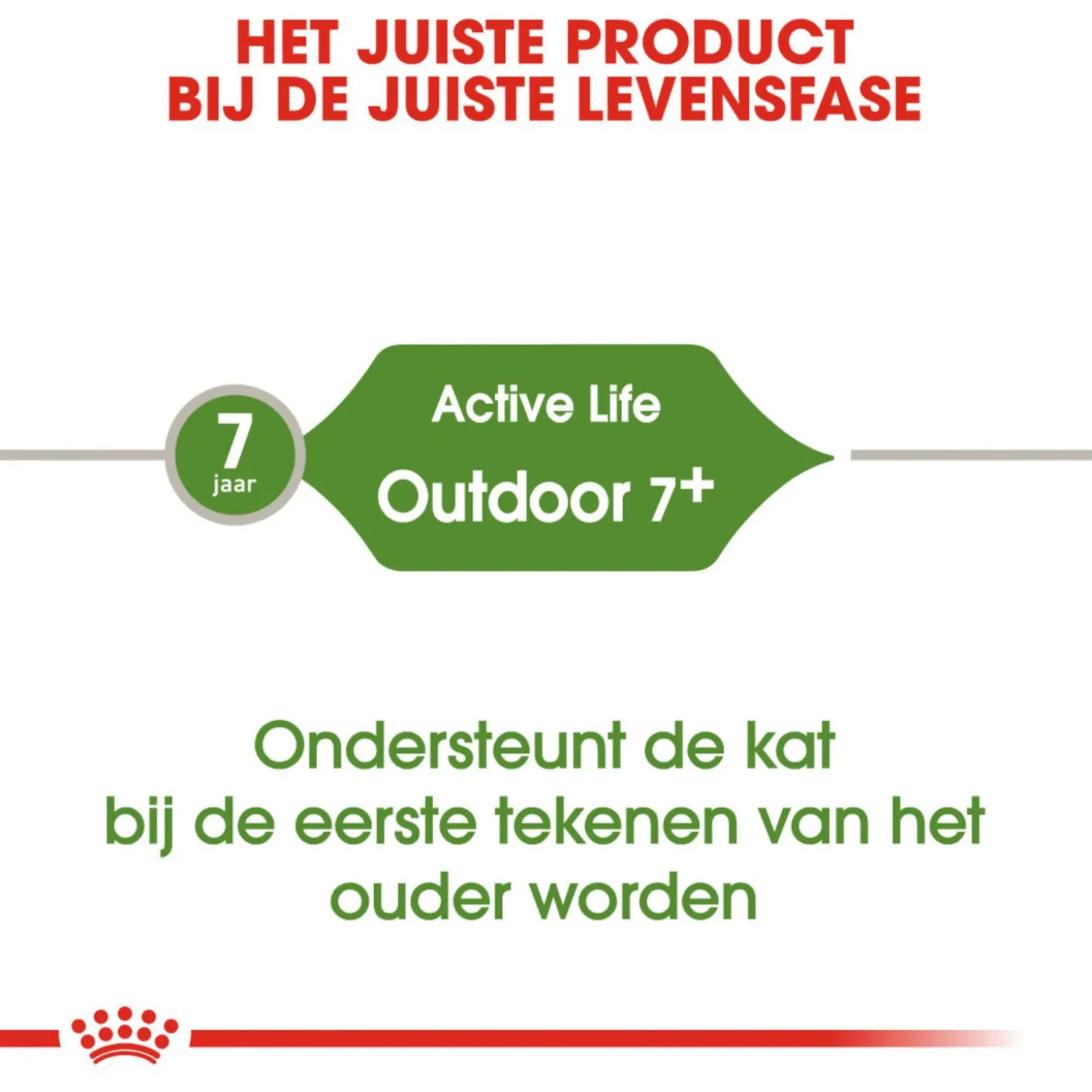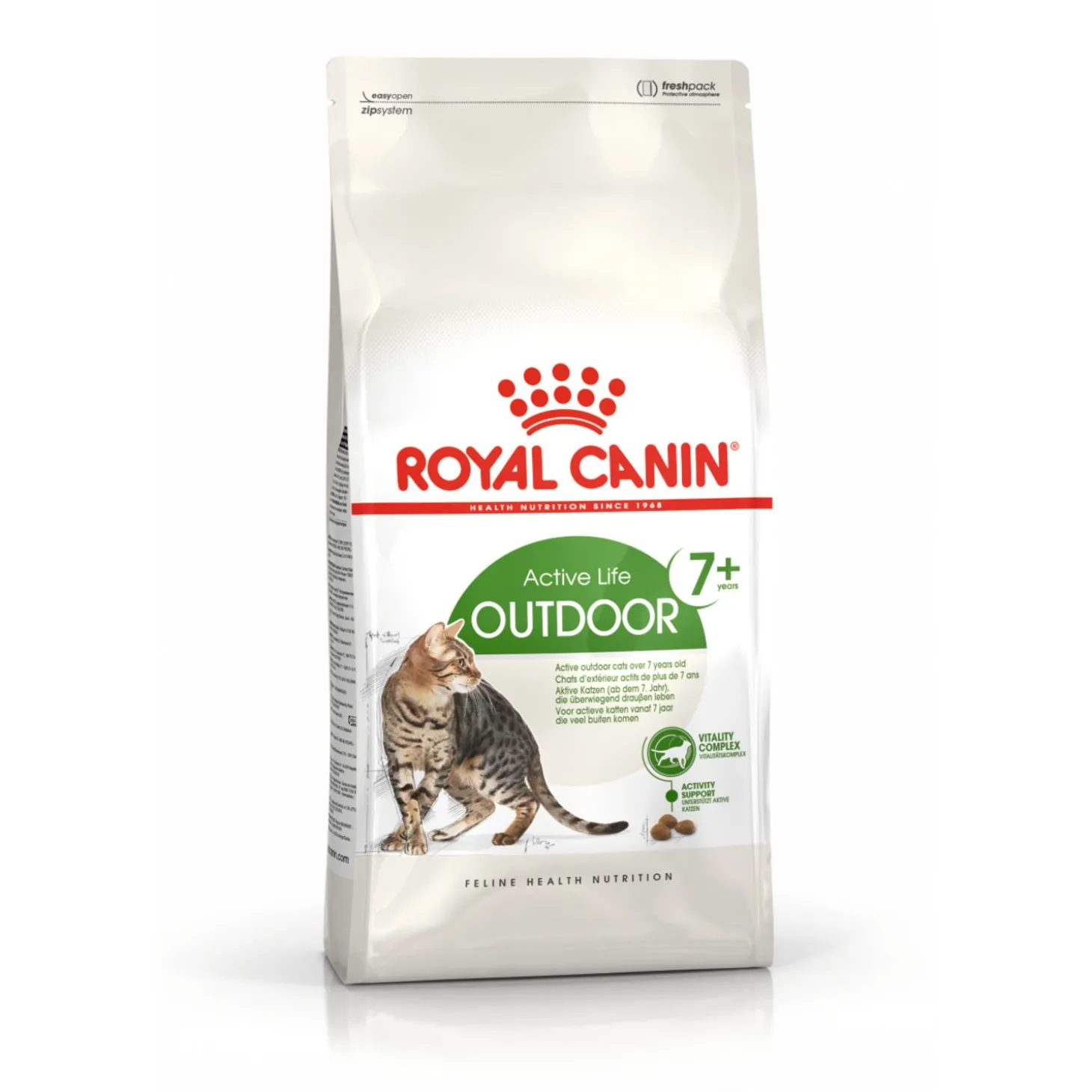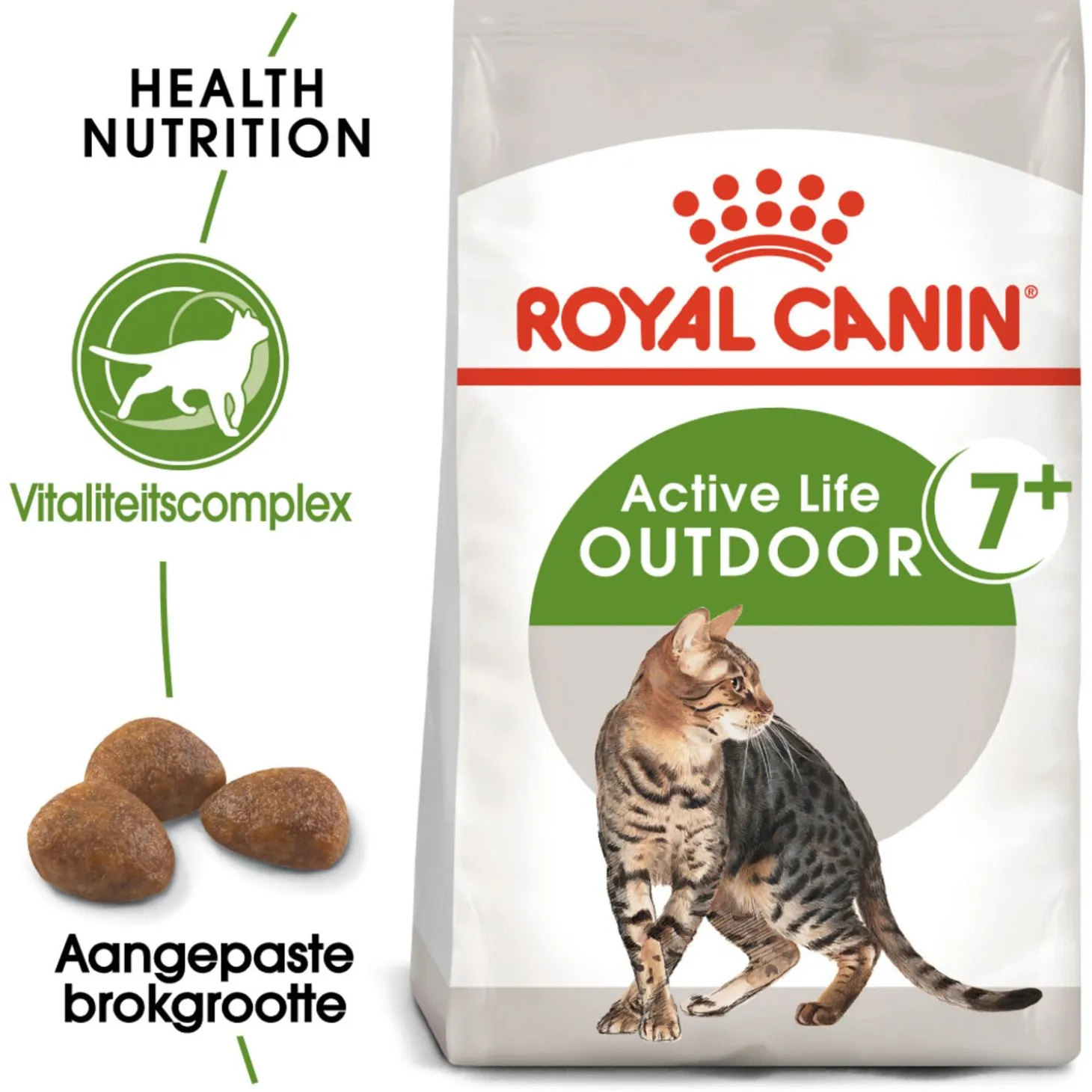 Royal Canin Outdoor 7+ is geschikt voor actieve buitenkatten van 7 jaar en ouder en bevat een exclusief vitaliteitscomplex dat je kat ondersteunt vanaf de eerste symptomen van het ouder worden. De voeding is verrijkt met specifieke voedingsstoffen zoals groene thee polyfenolen, vitamine C, EPA en DHA. Ter ondersteuning van de activiteiten van je kat, zoals rennen, springen en klimmen bevat Outdoor 7+ voedingsstoffen die de gezonde gewrichten van je kat helpen te ondersteunen.