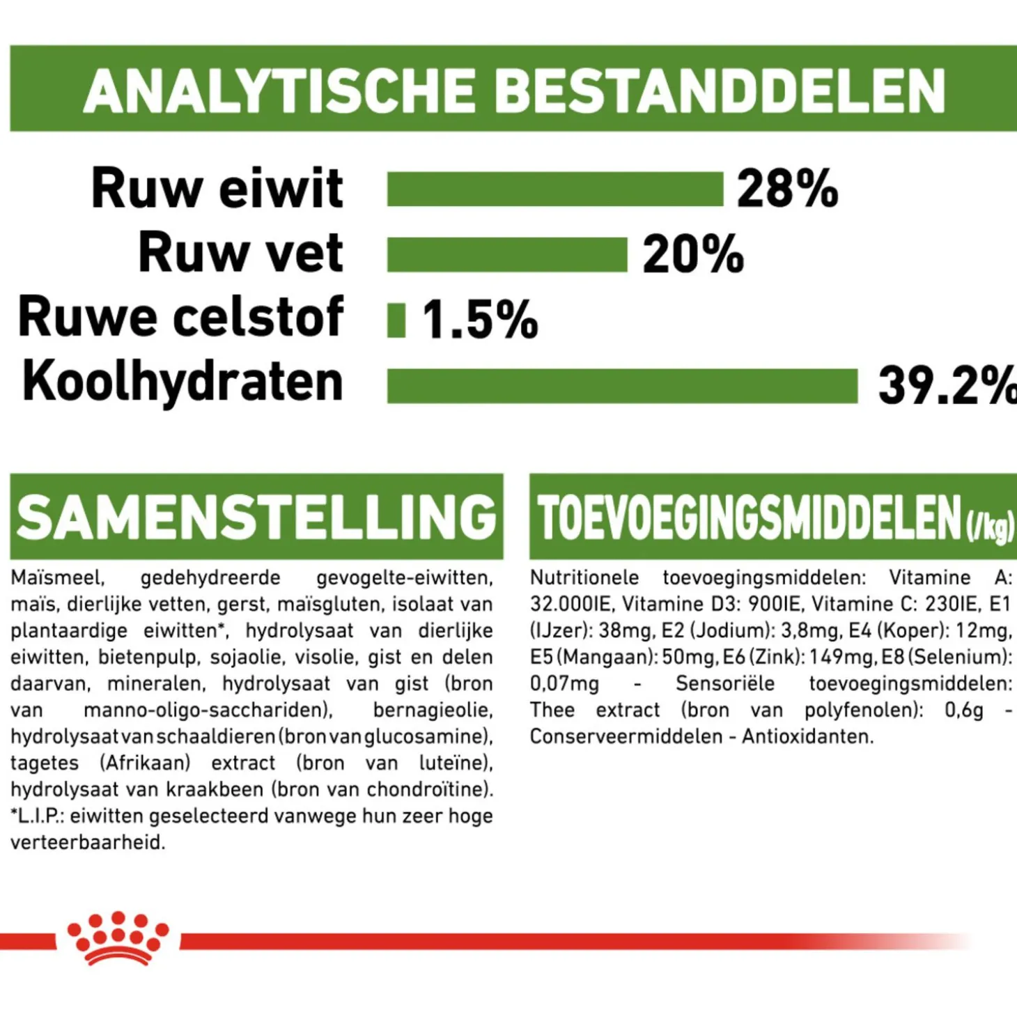 | Samenstelling | Maïsmeel, gedehydreerde gevogelte-eiwitten, maïs, dierlijke vetten, maïsgluten, gerst, isolaat van plantaardige eiwitten*, hydrolysaat van dierlijke eiwitten, bietenpulp, sojaolie, mineralen, visolie, bernagieolie, hydrolysaat van schaaldieren (bron van glucosamine), tagetes (afrikaan) extract (bron van luteïne), hydrolysaat van kraakbeen (bron van chondroïtine), gist en delen daarvan, hydrolysaat van gist (bron van manno-oligo-sacchariden) *l.i.p.: hoogwaardige eiwitten die zeer goed verteerbaar zijn. |