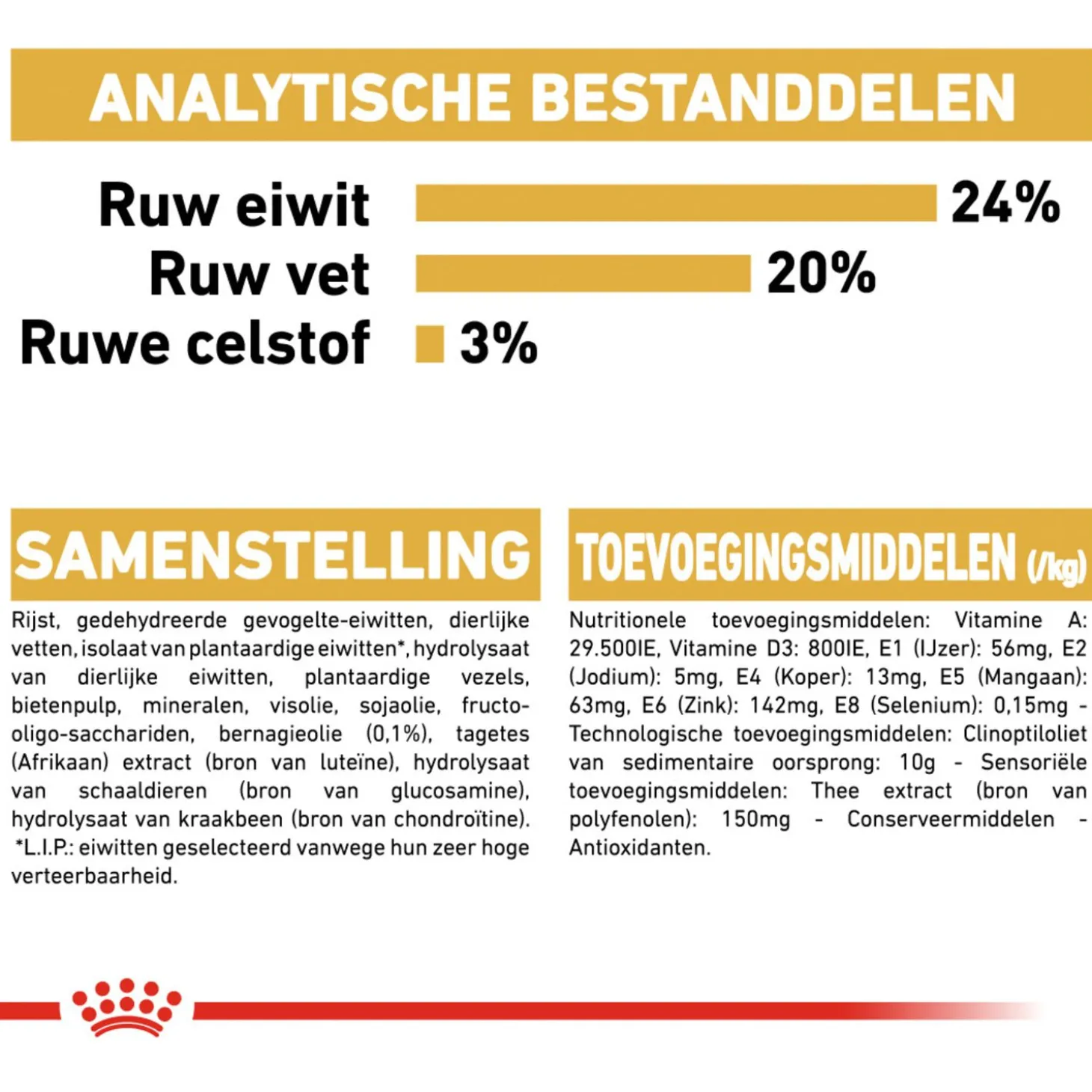 | Samenstelling | Rijst, gedehydreerde gevogelte-eiwitten, dierlijke vetten, isolaat van plantaardige eiwitten*, hydrolysaat van dierlijke eiwitten, plantaardige vezels, bietenpulp, mineralen, visolie, sojaolie, bernagieolie (0.1%), tagetes (afrikaan) extract (bron van luteïne), hydrolysaat van schaaldieren (bron van glucosamine), hydrolysaat van kraakbeen (bron van chondroïtine), fructi-oligo-sacchariden (0,34%) *l.i.p.: hoogwaardige eiwitten die zeer goed verteerbaar zijn. |