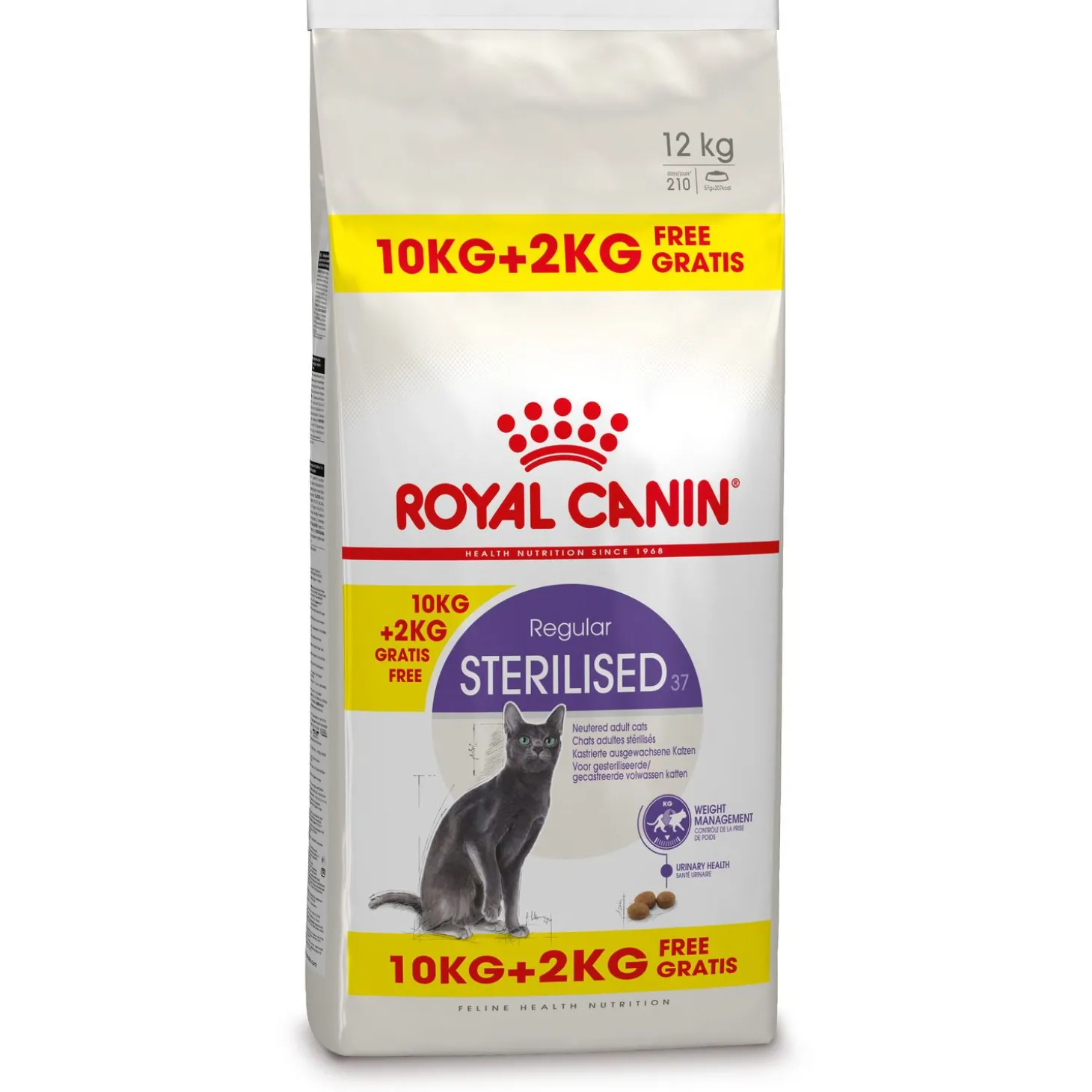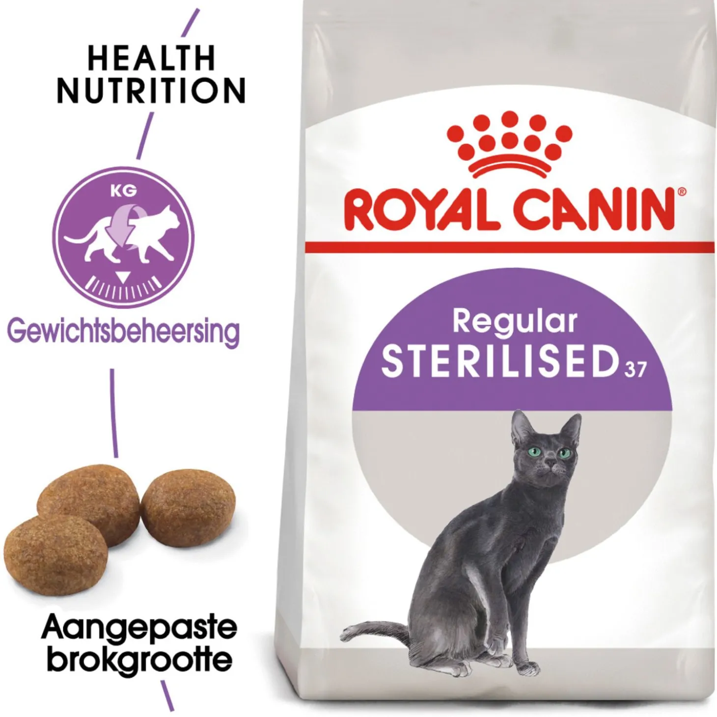 Royal Canin Sterilised 37 is verkrijgbaar in 400 gr, 2 kg, 4 kg en 10 kg.