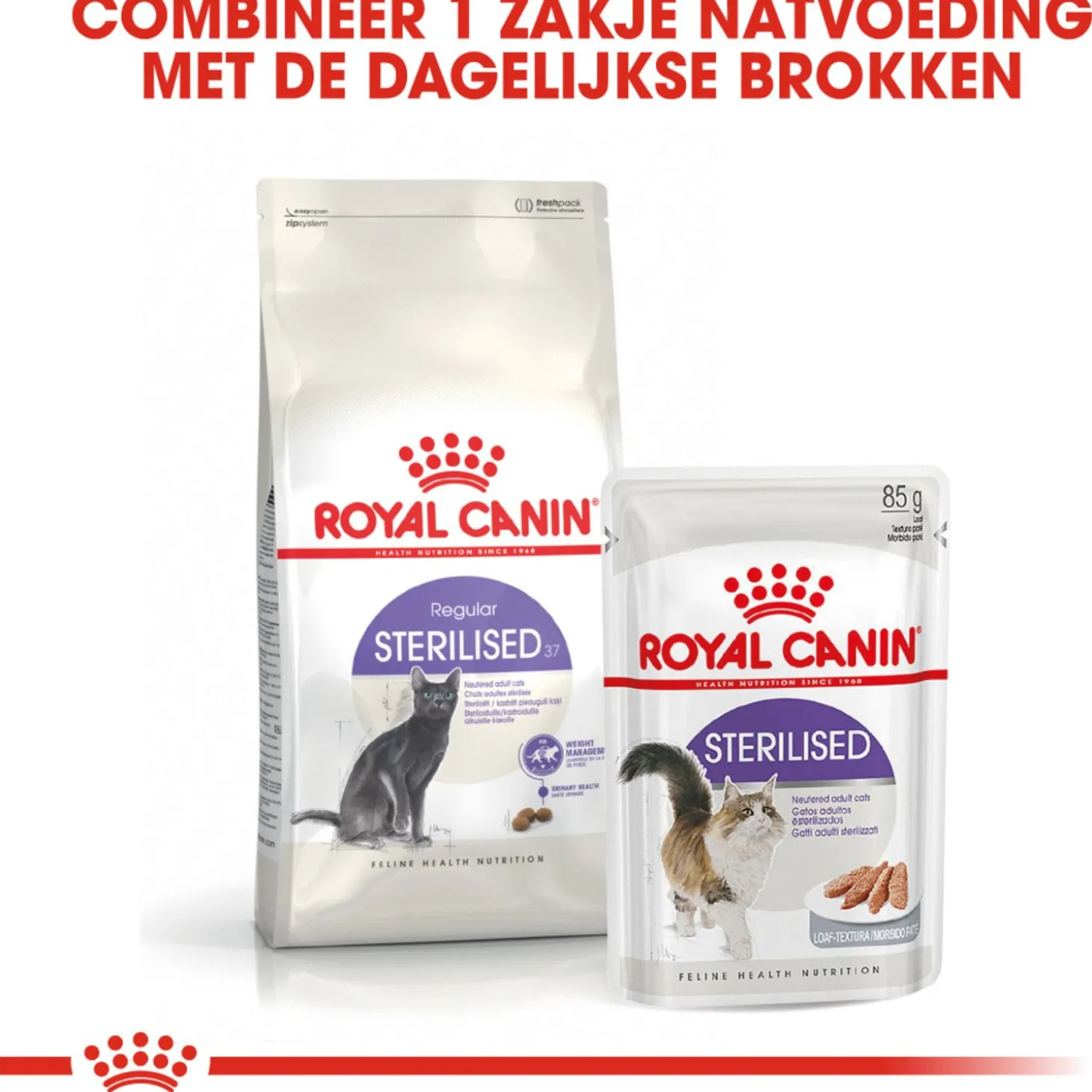 Royal Canin Sterilised 37 is ook beschikbaar als natte voeding in een overheerlijke saus of in een smakelijke gelei. Volg de voedingsrichtlijnen van Royal Canin als je van plan bent om je kat gemengd te voeren, zodat zij de optimale hoeveelheden droog- en natvoeding voorgeschoteld krijgt.