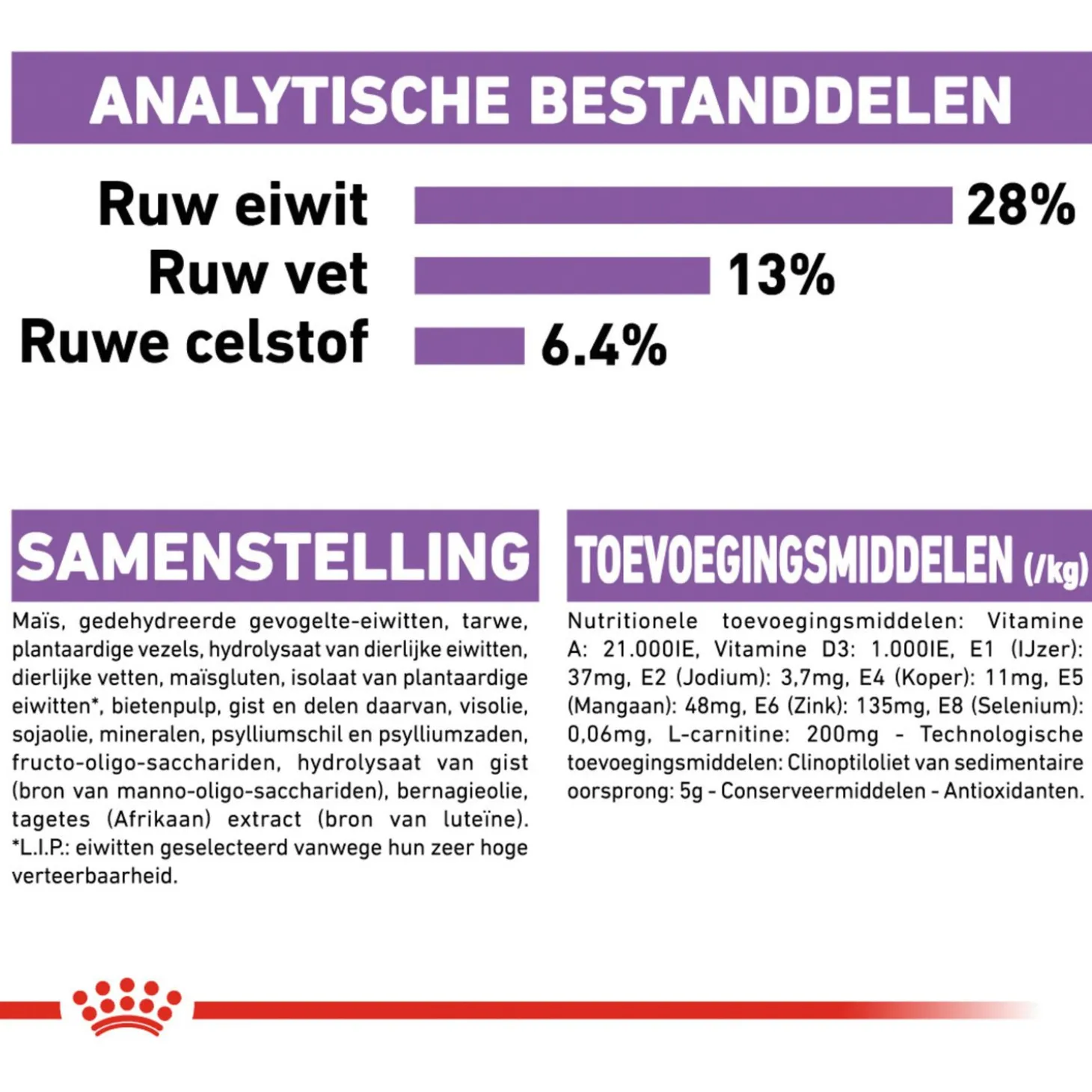 | Samenstelling | Maïs, gedehydreerde gevogelte-eiwitten, tarwe, maïsgluten, plantaardige vezels, hydrolysaat van dierlijke eiwitten, dierlijke vetten, bietenpulp, isolaat van plantaardige eiwitten*, visolie, sojaolie, mineralen, psylliumschil en psylliumzaden, fructo-oligo-sacchariden, bernagieolie, hydrolysaat van gist (bron van manno-oligo-sacchariden), gist en delen daarvan, tagetes (afrikaan) extract (bron van luteïne) *l.i.p.: hoogwaardige eiwitten die zeer goed verteerbaar zijn. |