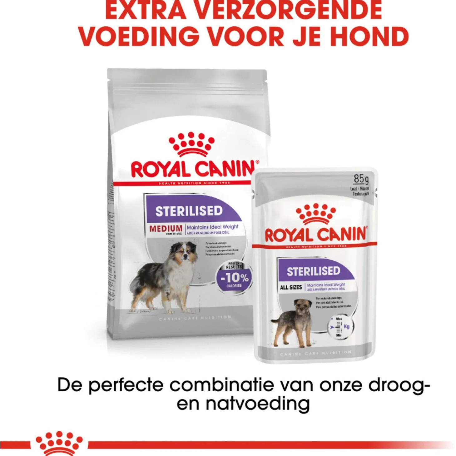 Sterilised Medium bevat maar liefst 10 procent minder calorieën dan gewone voeding voor volwassen honden. Het Sterilised voedingsprogramma bestaat uit twee componenten: krokante brokken en een overheerlijk natvoer in een pouch. Beiden zijn compleet van samenstelling en vullen elkaar perfect aan.