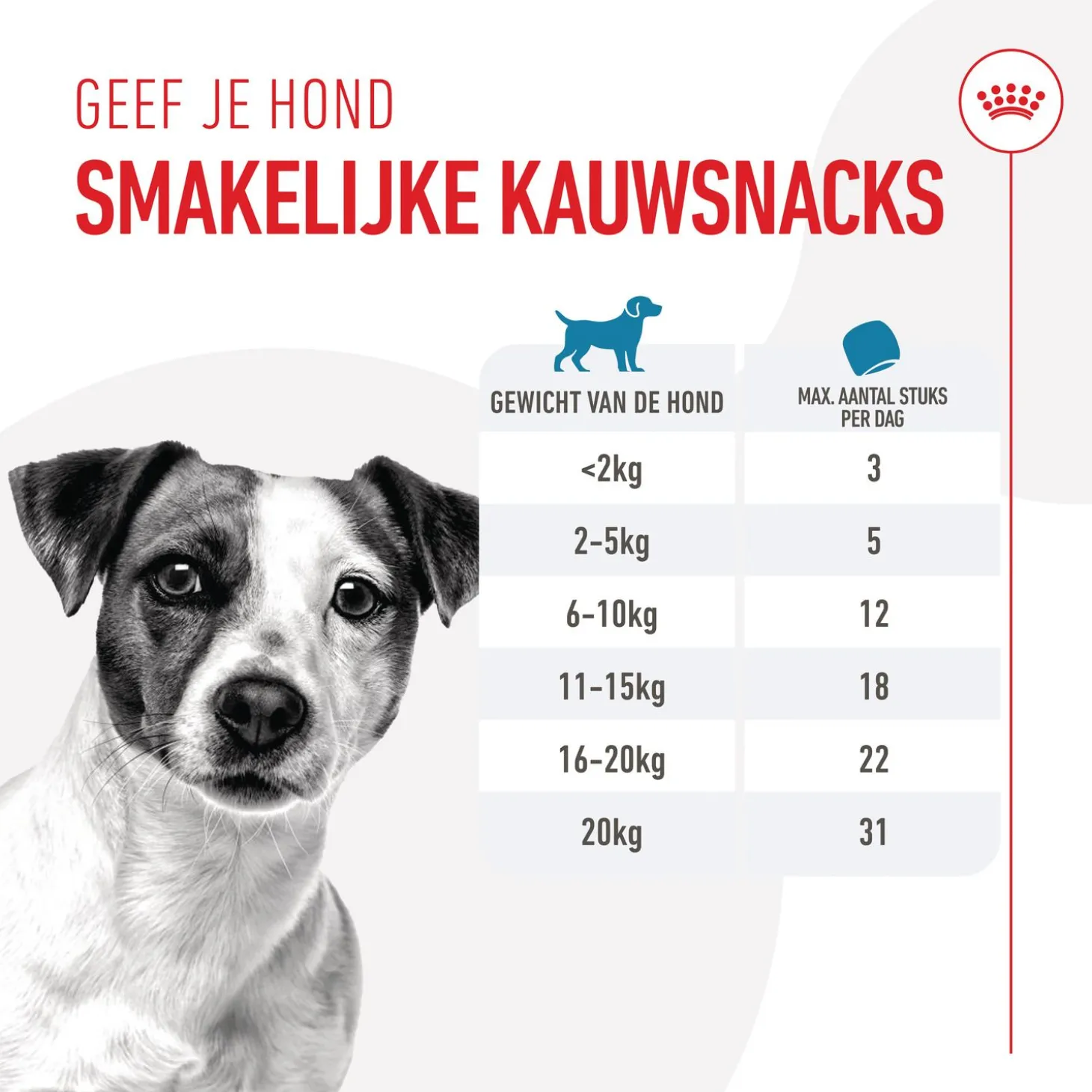 | Aanbeveling | GEBRUIKSAANWIJZING: snacks voor honden vanaf 6 maanden. Geef je hond niet meer dan het maximale aantal snacks per dag zoals aangegeven in de voedingsrichtlijnen. Als je je hond snacks geeft, is het aan te raden om de portiegrootte van de hoofdmaaltijd overeenkomstig aan te passen, zodat je hond een gezond lichaamsgewicht behoudt. Raadpleeg je dierenarts als je vragen hebt. Productiecode, registratienummer en ten minste houdbaar tot: zie verpakking. Bewaren in een droge en koele omgeving. Er moet altijd water beschikbaar zijn. |
