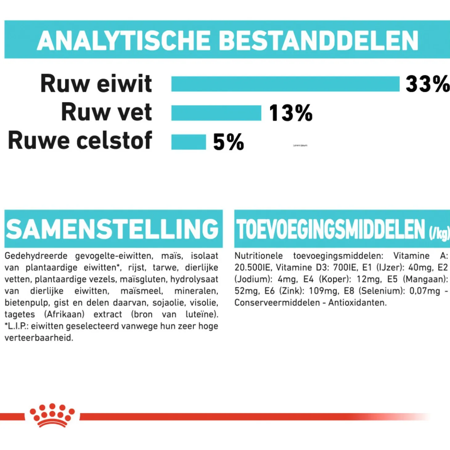 | Samenstelling | Gedehydreerde gevogelte-eiwitten, maïs, isolaat van plantaardige eiwitten*, rijst, tarwe, dierlijke vetten, plantaardige vezels, maïsgluten, hydrolysaat van dierlijke eiwitten, maïsmeel, mineralen, bietenpulp, gist, sojaolie, visolie, tagetes (afrikaan) extract (bron van luteïne) *l.i.p.: hoogwaardige eiwitten die zeer goed verteerbaar zijn. |