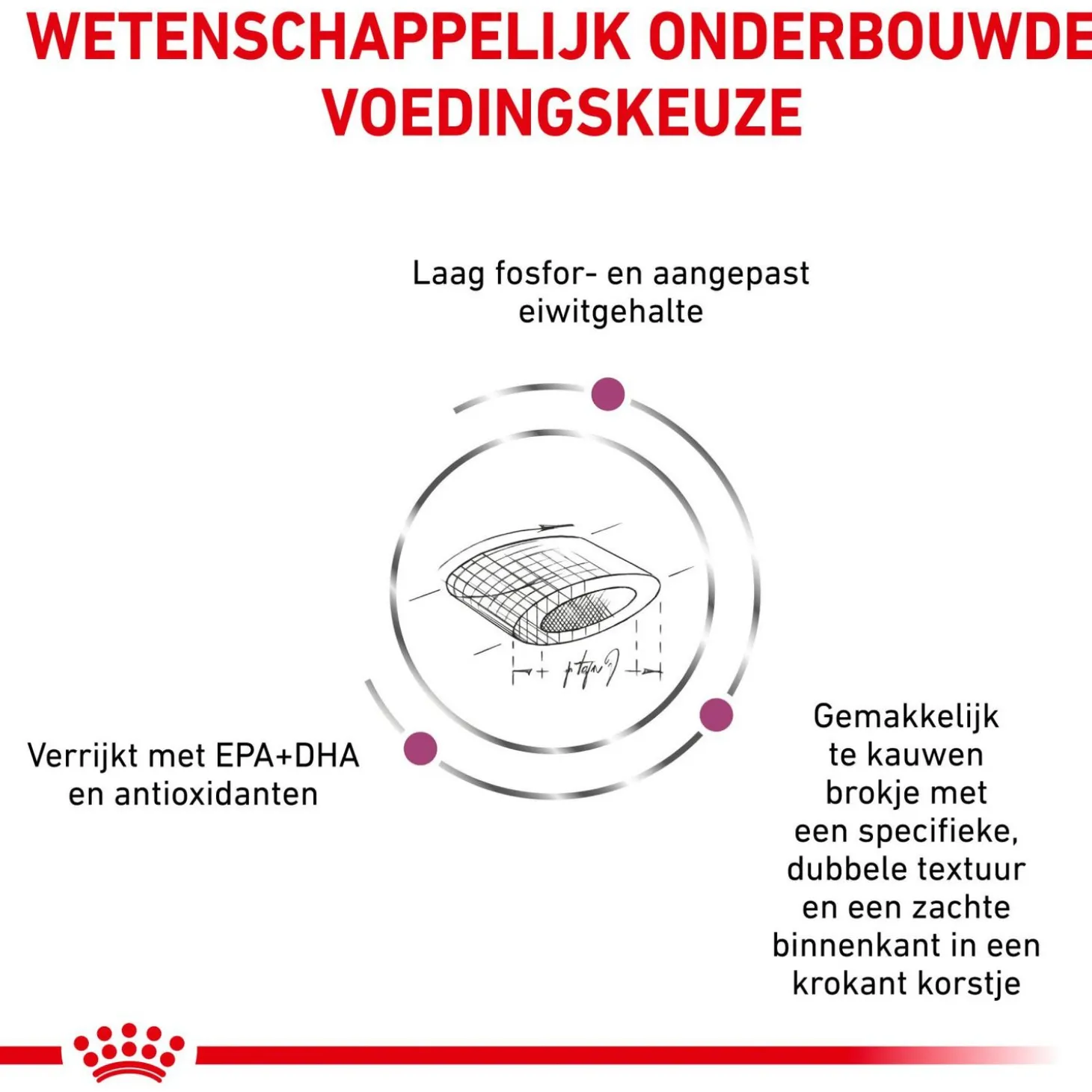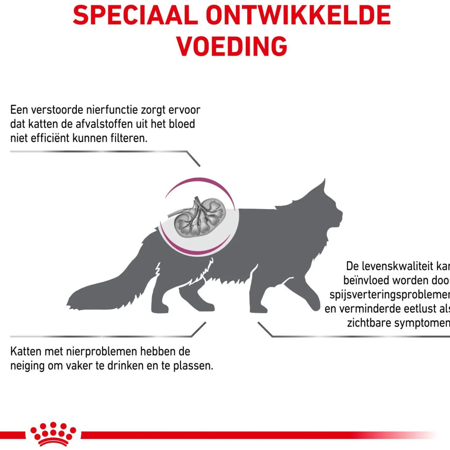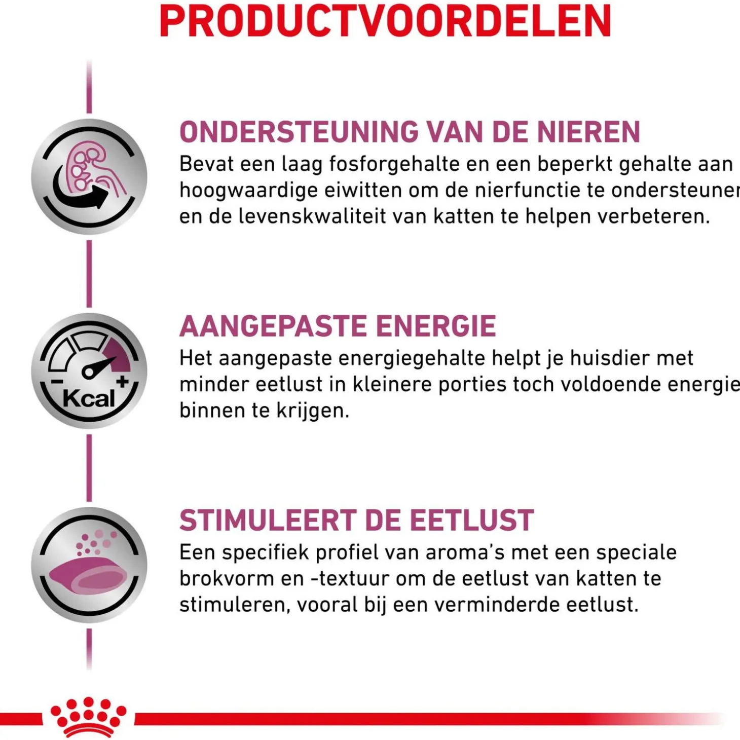 Het voer bevat een beperkt fosforgehalte om de nierfunctie te ondersteunen. Ook worden de nieren ontlast door een gematigd gehalte aan kwalitatief hoogwaardige eiwitten.