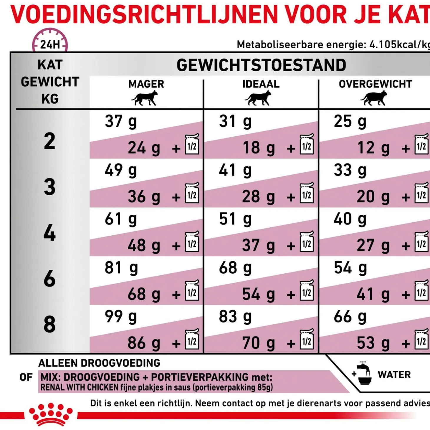 Houd tijdens het voeren van veterinair voer regelmatig contact met je arts. Mocht de gezondheid van je dier achteruit gaan, win dan zo snel mogelijk advies in. Je dierenarts kan je het beste adviseren over de behandeling, het te volgen dieet en de benodigde hoeveelheden.