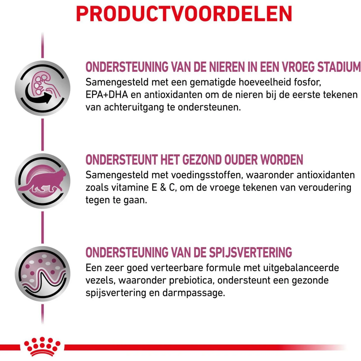Het voer bereikt dit dankzij de speciale samenstelling met o.a. een gematigd fosforgehalte, EPA en DHA en een antioxidantencomplex. Ook bevat het voer nutriënten ter ondersteuning van oudere katten, zoals de spijsvertering.