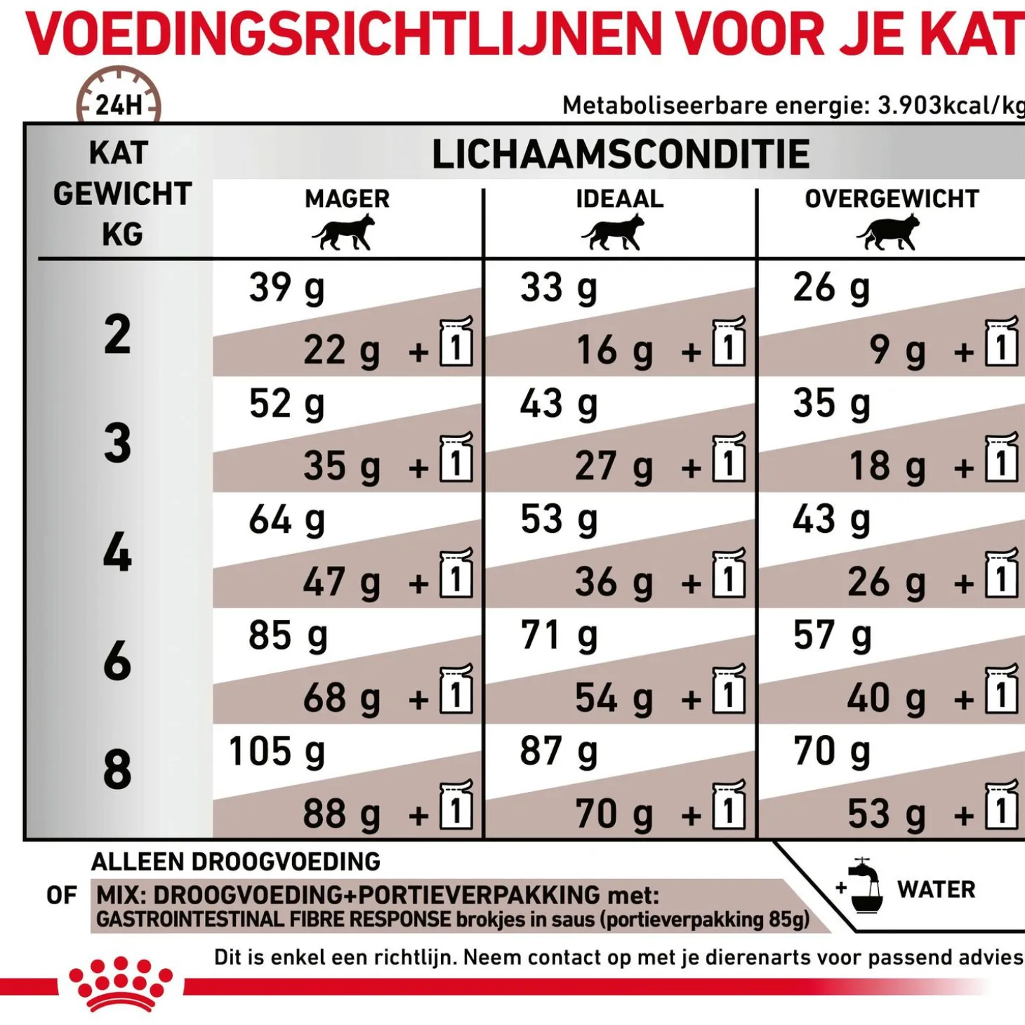 Houd tijdens het voeren van veterinair voer regelmatig contact met je arts. Mocht de gezondheid van je dier achteruit gaan, win dan zo snel mogelijk advies in. Je dierenarts kan je het beste adviseren over de behandeling, het te volgen dieet en de benodigde hoeveelheden.