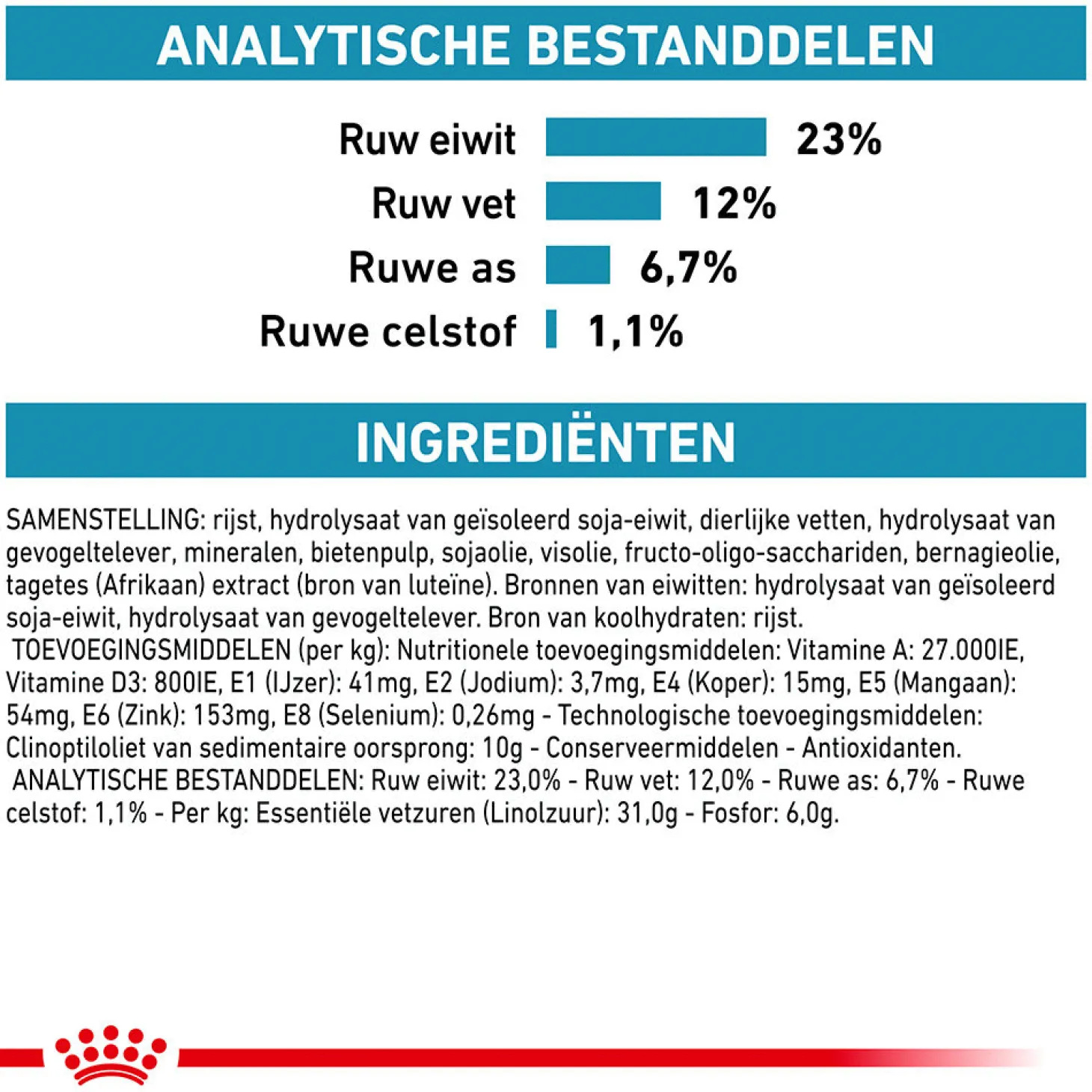 | Samenstelling | Rijst, hydrolysaat van geïsoleerd soja-eiwit, dierlijke vetten, gehydrolyseerd gevogeltelever, mineralen, bietenpulp, sojaolie, visolie, Fructo-Oligo-Sacchariden, bernagieolie, Tagetes (Afrikaan) extract (bron van luteïne) |