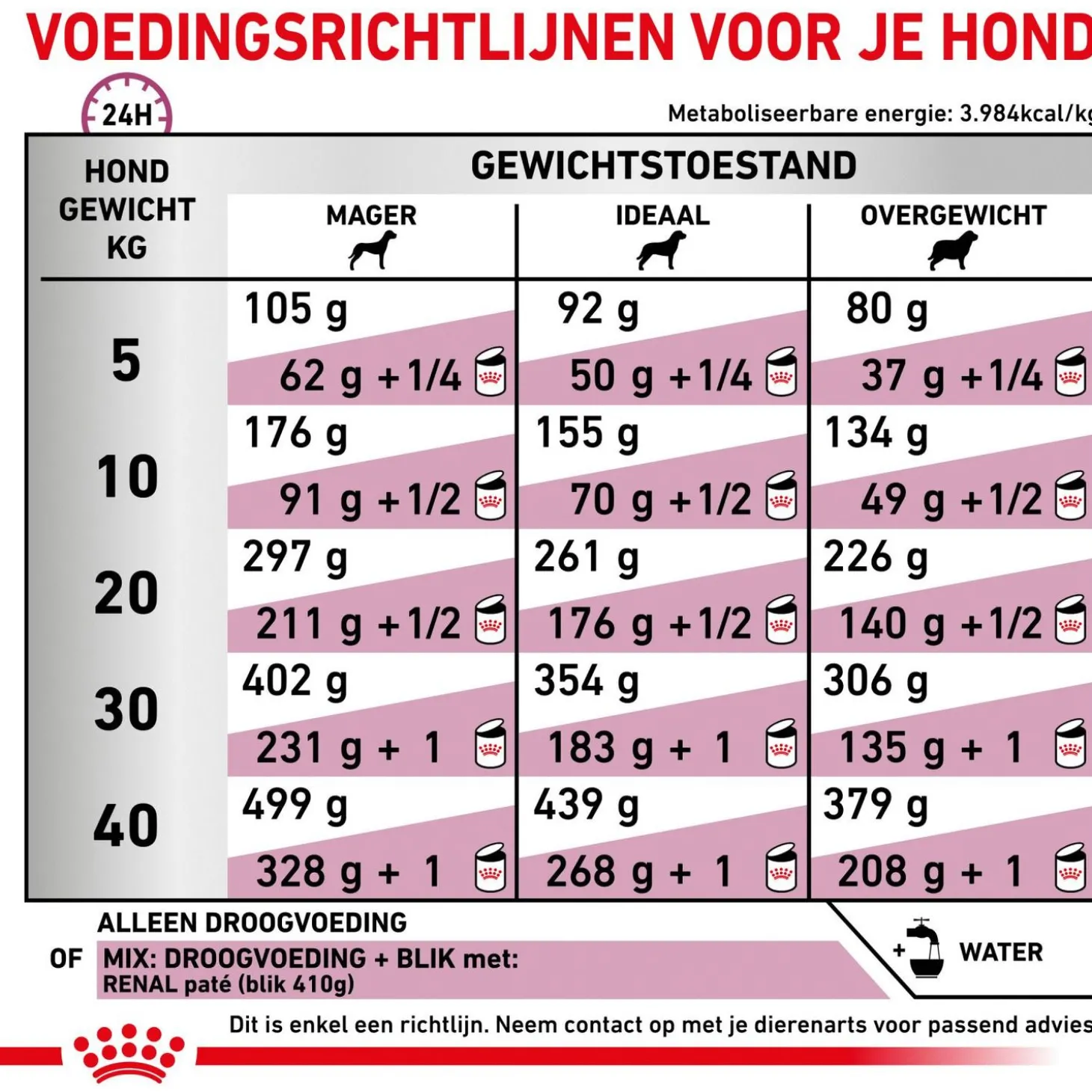 Renal bevat een aangepast energiegehalte, waardoor de hond slechts een kleine hoeveelheid hoeft te eten voor en vol gevoel. Ook heeft het voer een specifiek aromatisch profiel met een speciale brokvorm om de eetlust te stimuleren. Je kunt de eetlust nog verder stimuleren door je hond zowel nat- als droogvoer te geven.