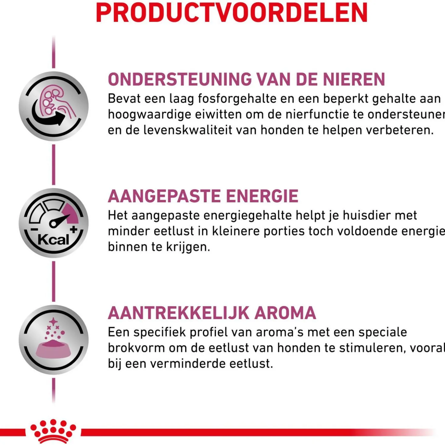 Voeding speelt een belangrijke rol bij het behandelen van nierproblemen. Renal Select Canine is speciaal ontwikkeld om de nierfunctie te ondersteunen bij een chronische aandoening. Vaak hebben honden met nieraandoeningen een verminderde eetlust, Renal Select Canine is extra smakelijk gemaakt zodat ook deze honden hun voeding nog zullen blijven eten. Het voer bevat een beperkt fosforgehalte om de nierfunctie te ondersteunen. Ook zijn er flavanolen toegevoegd die de celveroudering vertragen en de doorbloeding van de nieren verbeteren. Als laatste zorgen omega 3-vetzuren voor een gezonde huid en vacht.