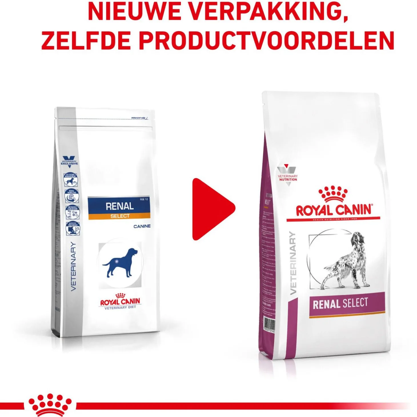 Royal Canin Veterinary Diet Renal Select Canine is te verkrijgen als 2kg en 10 kg zak.