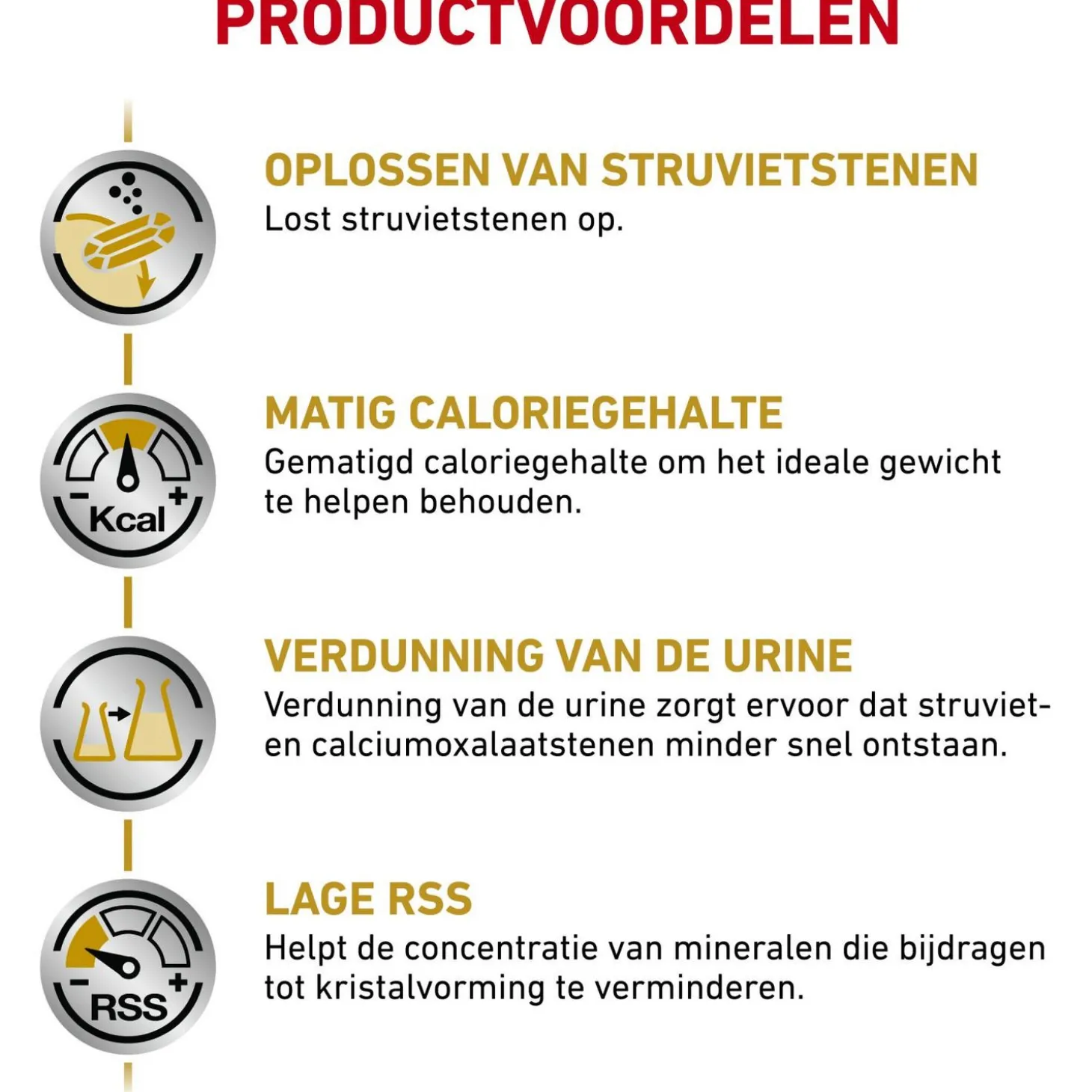 - Ondersteuning bij het voorkomen van de vorming van struviet- en calciumoxalaatstenen