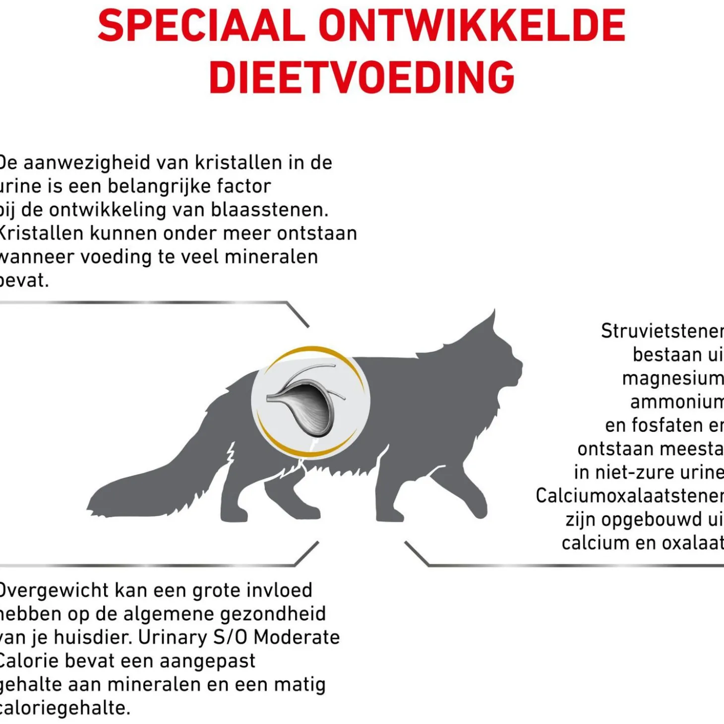 Urinary S/O Moderate Calorie kan worden ingezet voor het voorkomen en het oplossen van urinekristallen in de lagere urinewegen. Door de unieke samenstelling kunnen struvietstenen worden opgelost en kunnen zowel struviet- als calciumoxalaatstenen worden voorkomen. Het licht verhoogde natriumgehalte zorgt er daarbij voor dat de vochtopname wordt verhoogd. Hierdoor zal het urinevolume toenemen waardoor de concentratie aan kristalvormende deeltjes wordt beperkt. Deze voeding kan in combinatie met antibiotica ook worden gebruikt bij een blaasontsteking, overleg dit eerst met je dierenarts.