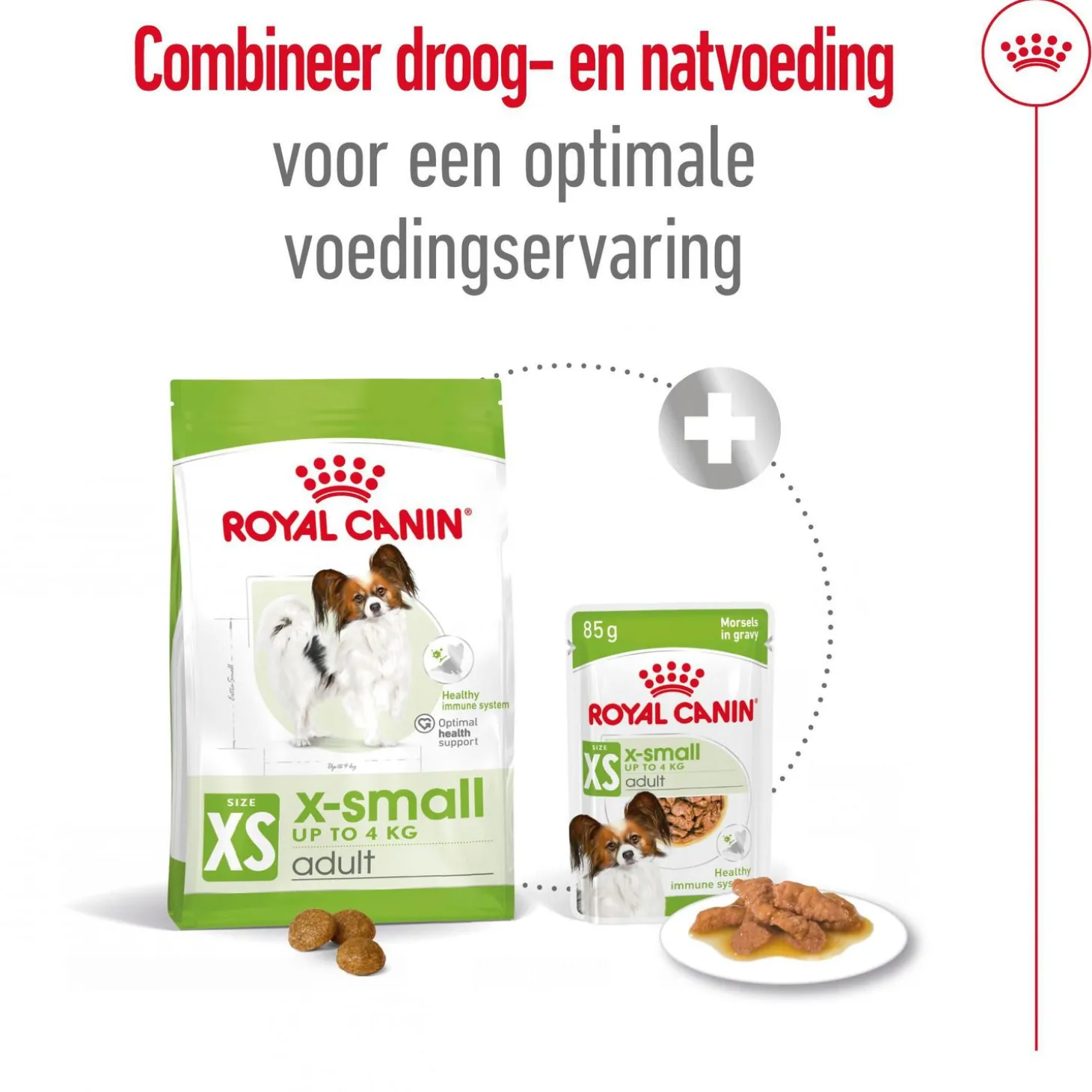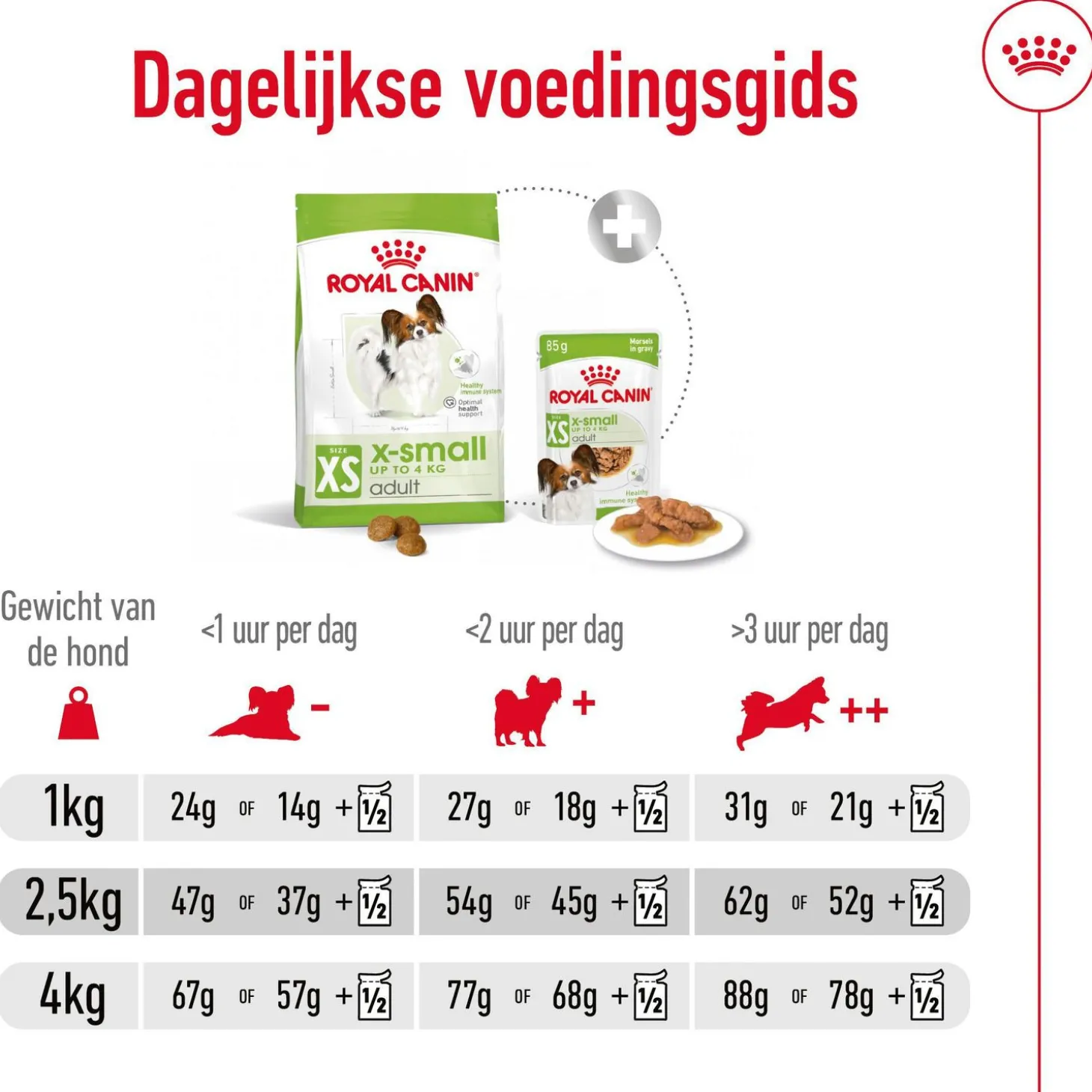 Royal Canin X-Small Adult is verkrijgbaar in 500 gr, 1,5 kg en 3 kg.