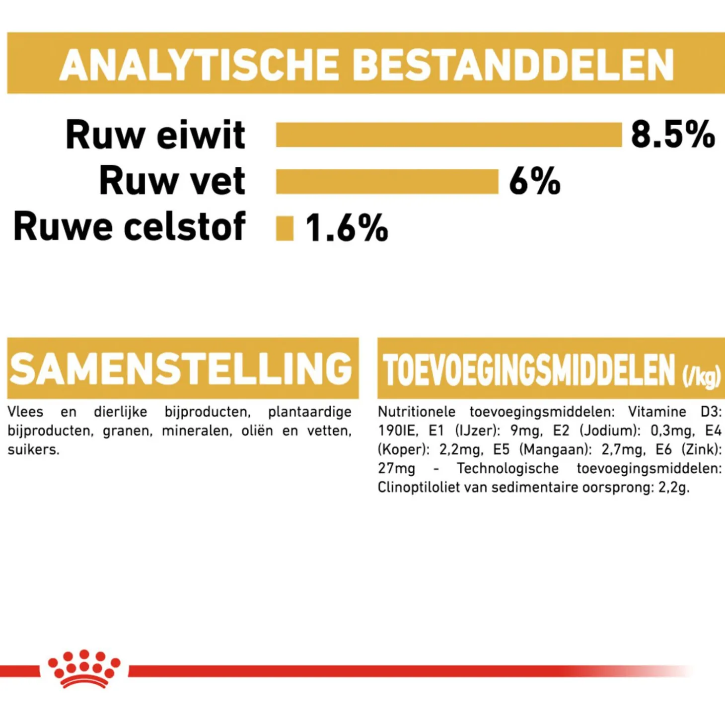 | Samenstelling | Vlees en dierlijke bijproducten, plantaardige bijproducten, granen, mineralen, oliën en vetten, suikers |
