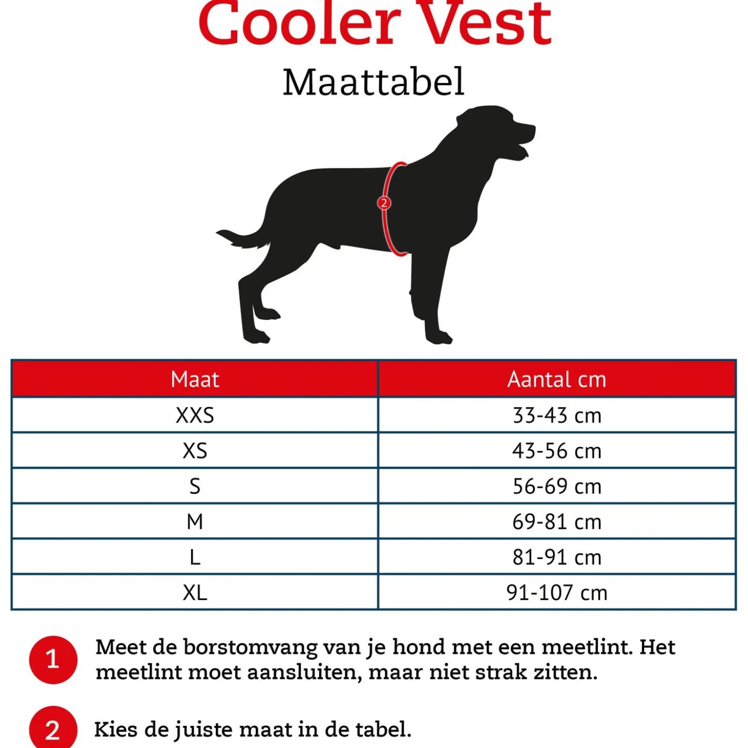 De buikomvang (B) meet je het beste net achter de voorpoten, op het breedste punt van de borst. Het meetlint moet goed aansluiten, maar moet niet te strak zitten.