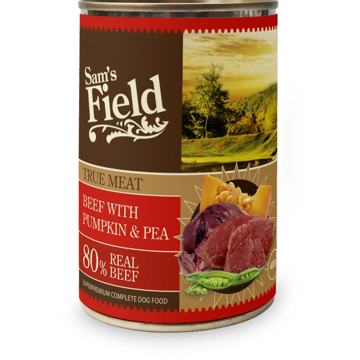 Sam’s Field True Meat bevat 6 x 400 gram (in de winkel per stuk verkrijgbaar).