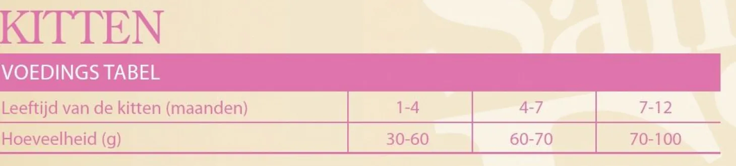 | Aanbeveling | De dagelijkse inname van voedingsstoffen volgens een vast schema speelt een belangrijke rol voor de gezondheid van jouw kat. Probeer altijd voor stabiele omstandigheden voor de voeding (plaats en tijd) en voor een bakje schoon water te zorgen. Als je meer dan één kat hebt, geef hun dan elk een eigen voerbakje. Geef het voer droog of bevochtigd met bouillon. Gebruik de voedingstabel op de verpakking om de juiste dagelijkse hoeveelheid te bepalen afhankelijk van de leeftijd en conditie van jouw kat. Zorg voor een goede band met jouw kat door regelmatig te spelen en te knuffelen. |