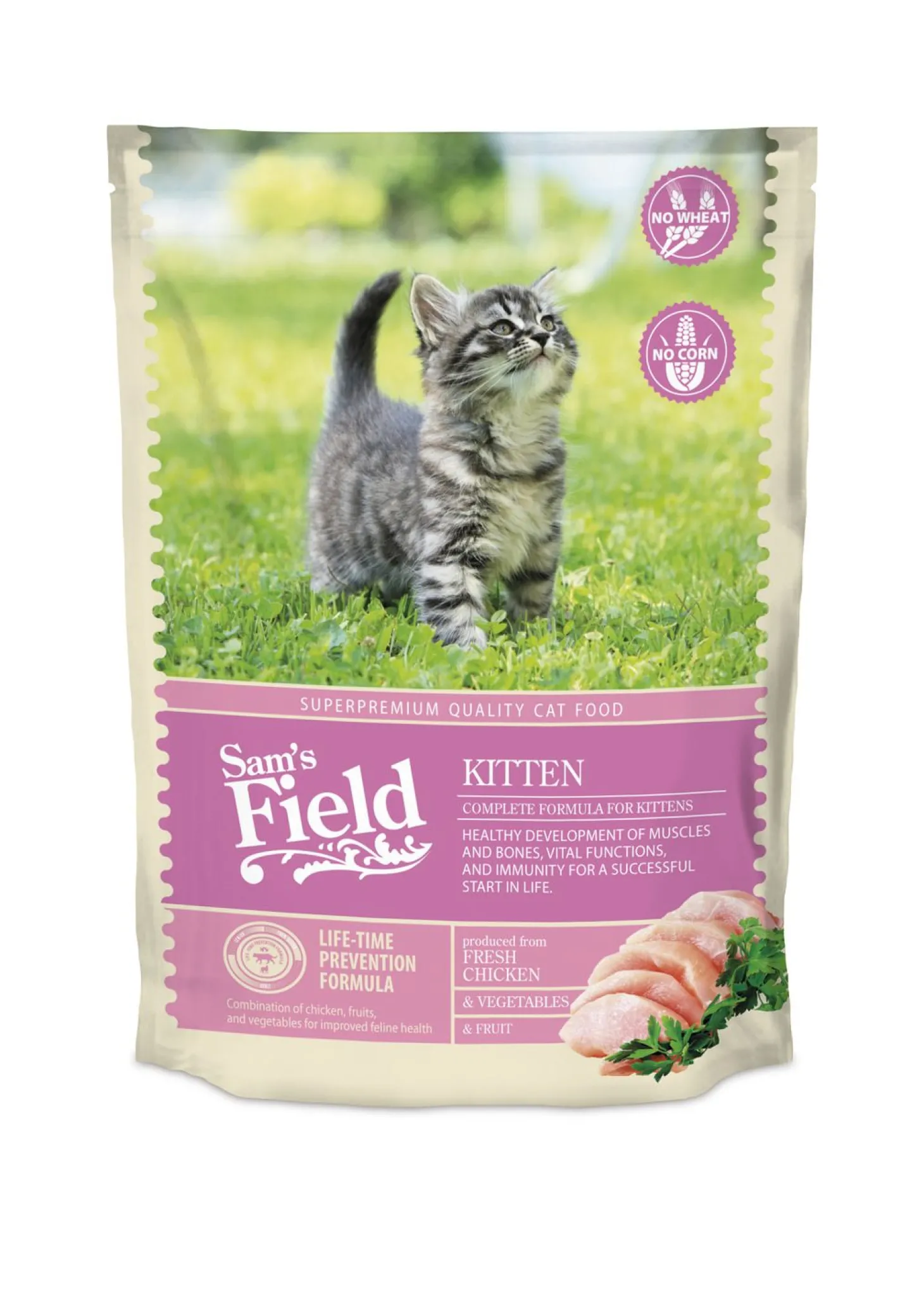 Wanneer je het beste voor hebt met je kitten, geef je hem natuurlijk een voeding die goed aansluit op zijn dagelijkse behoeften. Een verantwoorde keuze zijn de voedingen van Sam’s Field, zoals Sam’s Field Kitten Chicken. Deze natuurlijke voeding is graanarm en tarweglutenvrij en bevat kip en rijst als basisingrediënten.