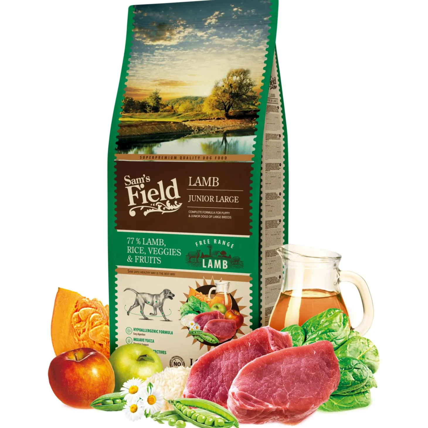 Sam’s Field Junior Large Lamb is verkrijgbaar in 2,5 en 13 kg.