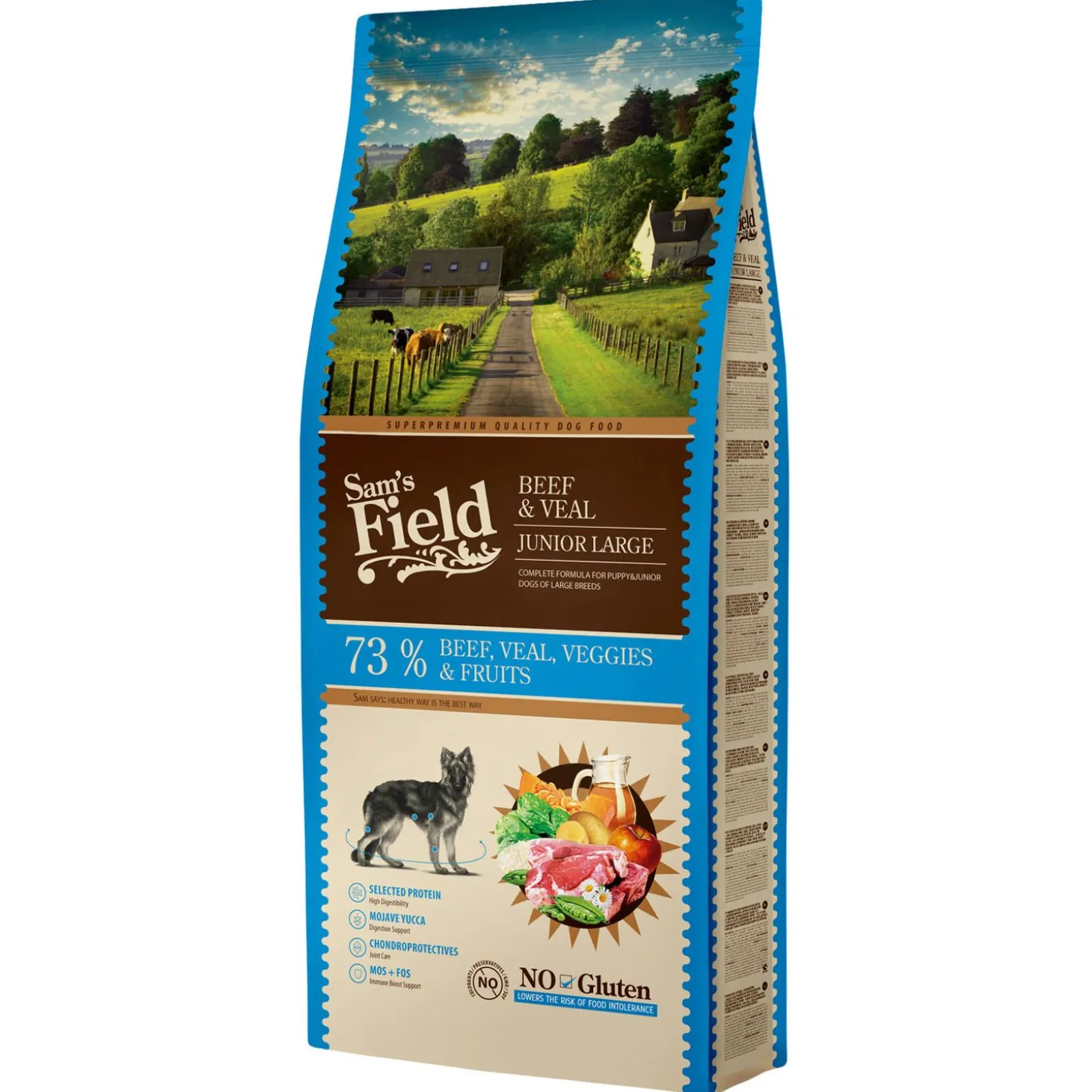 Sam’s Field Junior Large Breed Beef & Veal is verkrijgbaar in 2,5 en 13 kg.