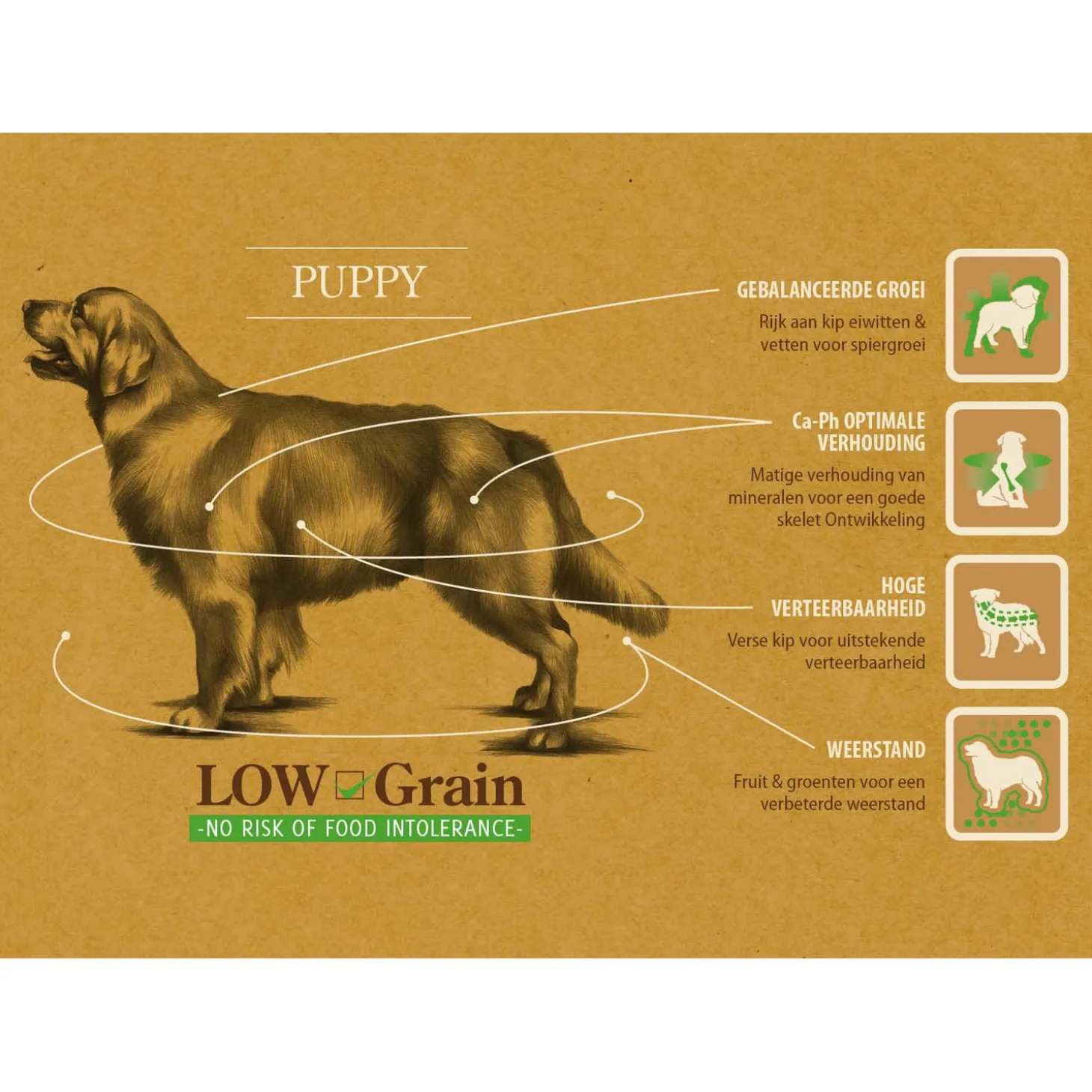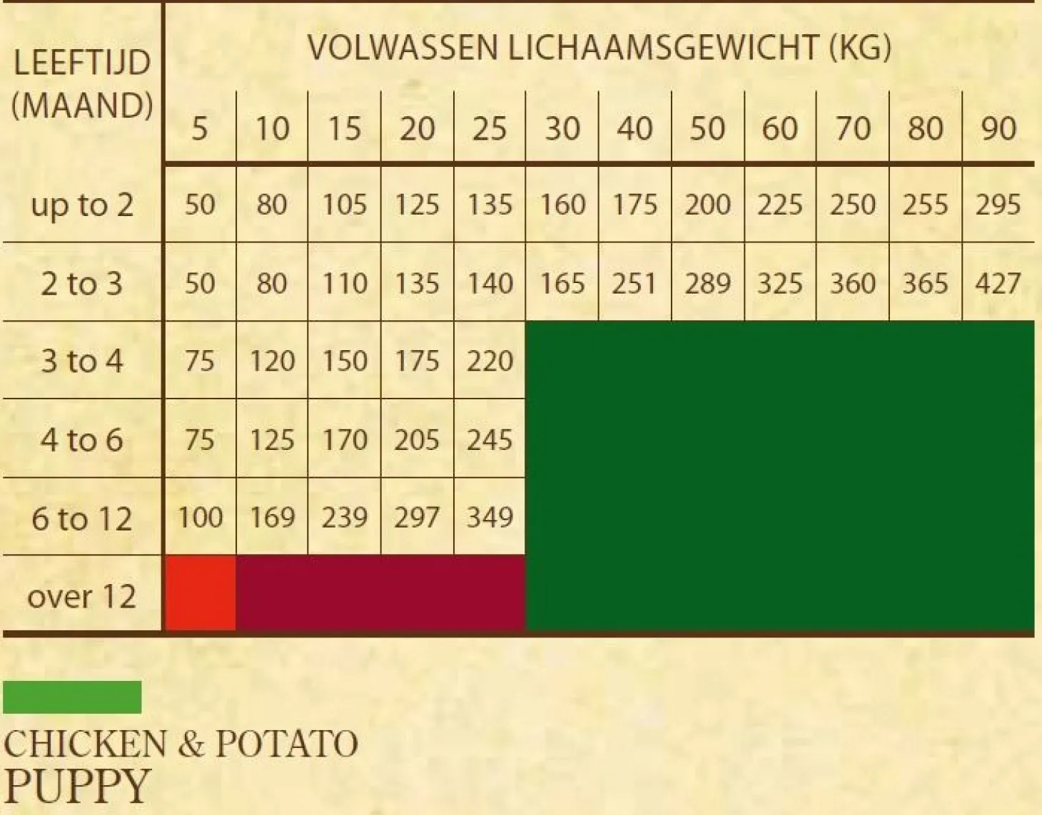 | Aanbeveling | De dagelijkse inname van voedingsstoffen volgens een vast voerschema speelt een cruciale rol in de gezondheid van jouw pup. Indien mogelijk, altijd zorgen voor stabiele voorwaarden voor het voeden (plaats en tijd), evenals een schaal met vers water. Als je meer dan één hond hebt, zorg er dan voor dat elke hond zijn eigen voerbak heeft. Serveer het voedsel droog of bevochtigd met bouillon. Gebruik de voedingstabel op de verpakking om de juiste dagelijkse hoeveelheid op basis van leeftijd en het streefgewicht van jouw pup te bepalen. Houd jouw pup in topconditie en ontwikkel een sterke relatie door te zorgen voor regelmatige lichaamsbeweging, spel en knuffelen. |