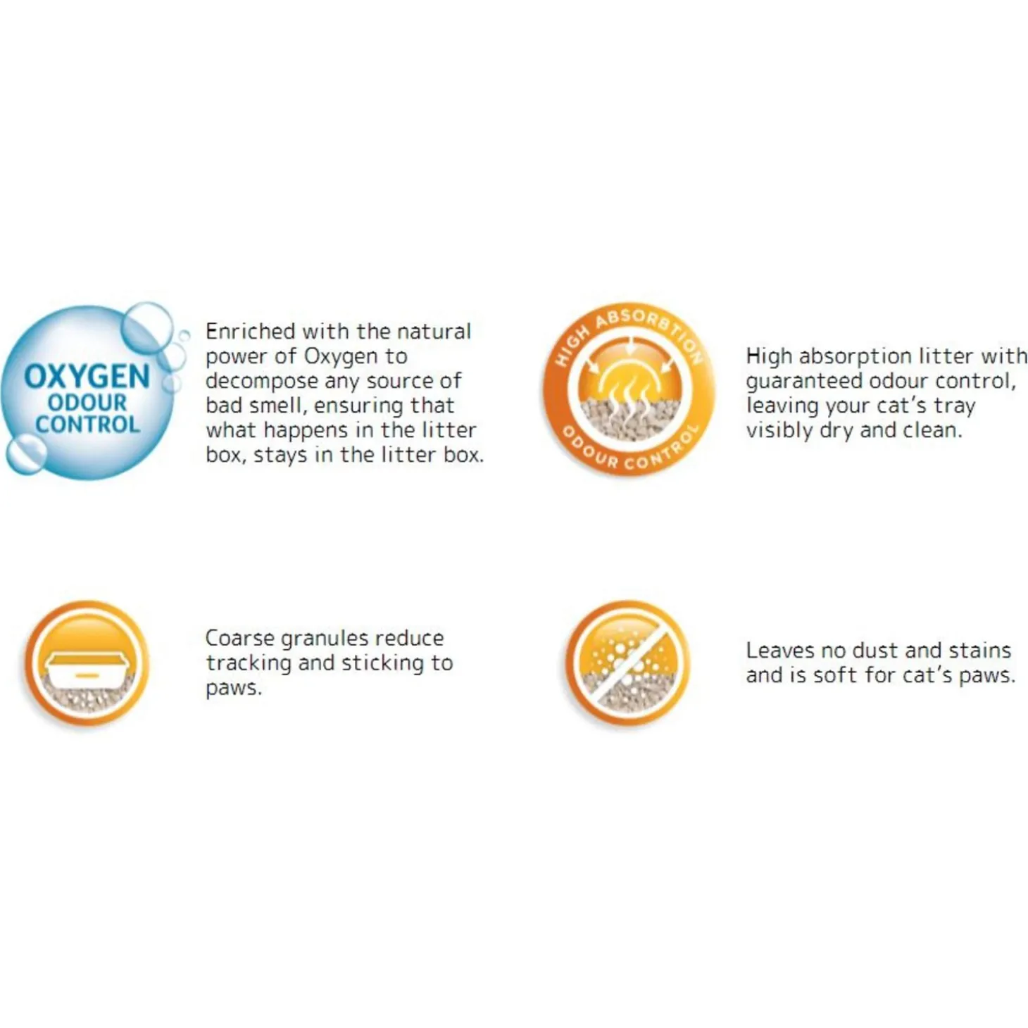 Deze kattenbakvulling is gemaakt van natuurlijke kleisoorten, namelijk Sepioliet. Deze sterk absorberende formule is verrijkt met de natuurlijke kracht van zuurstof. Zuurstof bestrijdt effectief nare geuren, zo zorg je ervoor dat wat in de kattenbak gebeurt, in de kattenbak blijft! zo kan jij lekker rondlopen in een fris ruikend huis.