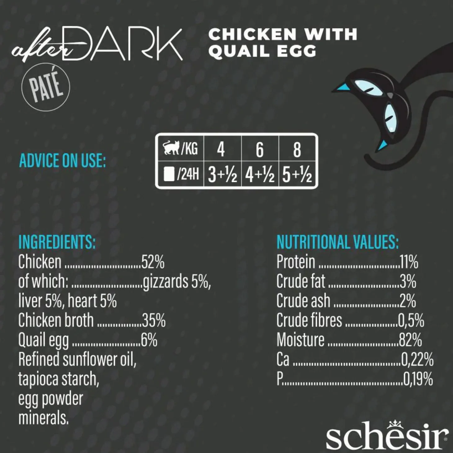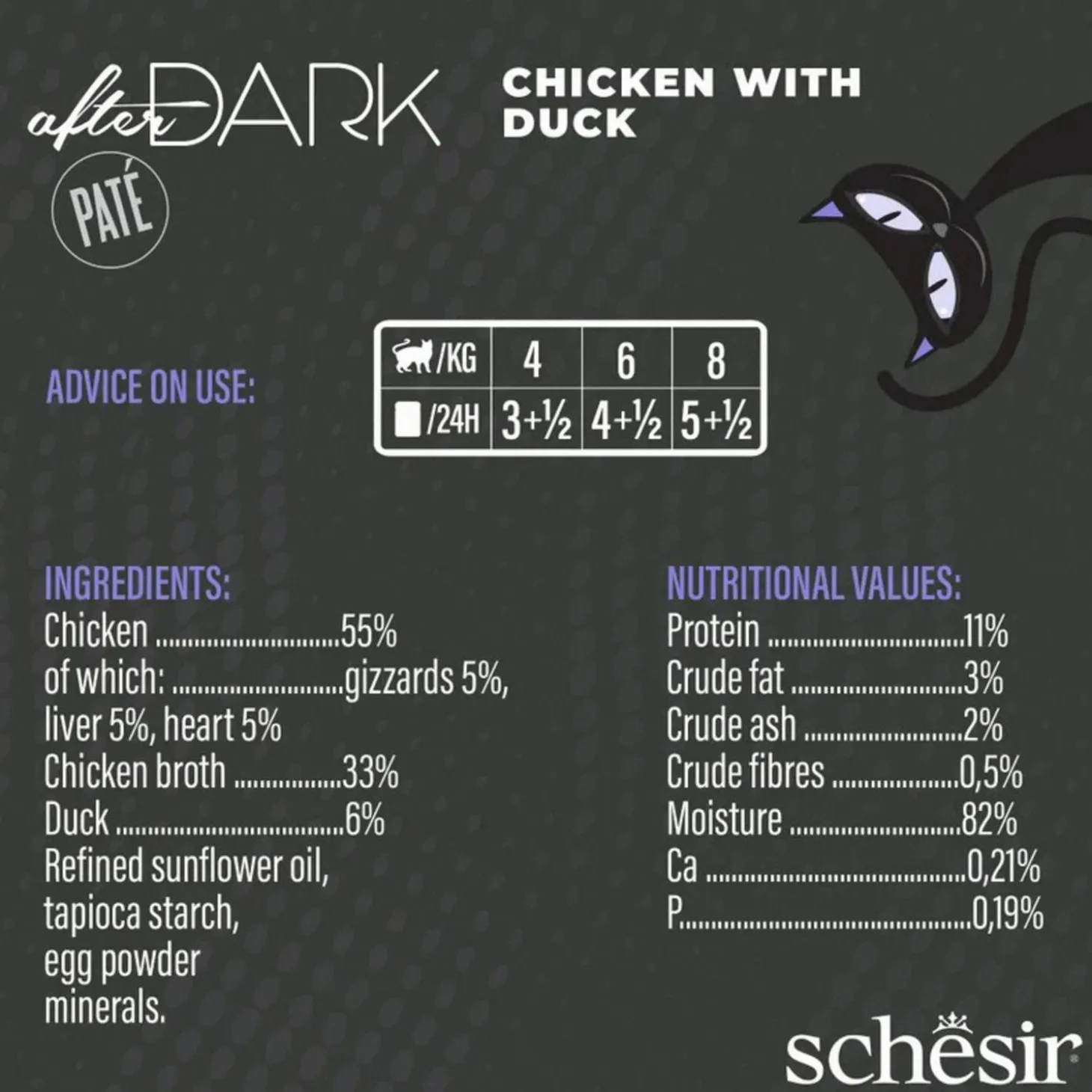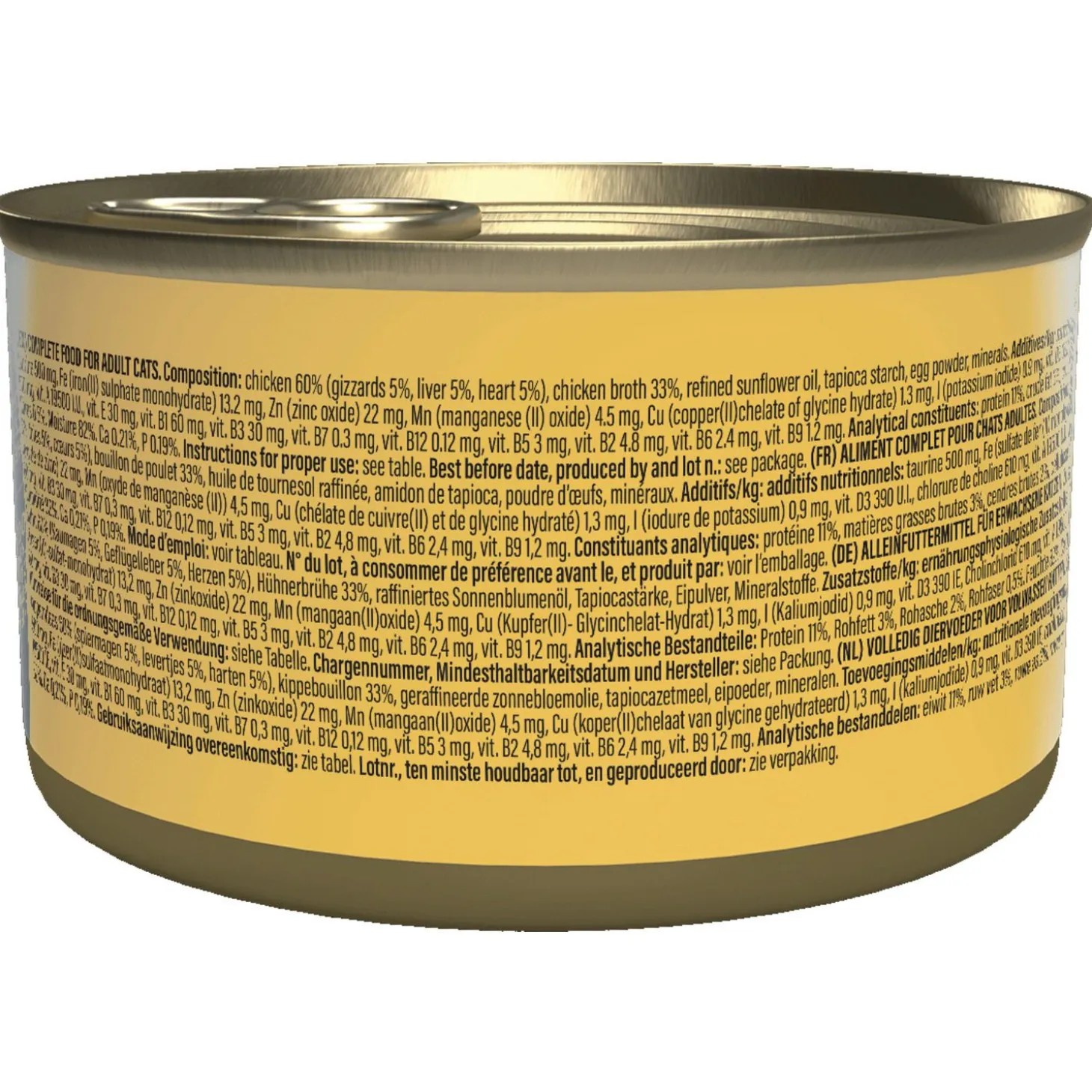 | Samenstelling | kip 55% (maagjes 5%, lever 5%, hart 5%), kippenbouillon 33%, rundvlees 6%, geraffineerde zonnebloemolie, tapiocazetmeel, eipoeder, mineralen. |