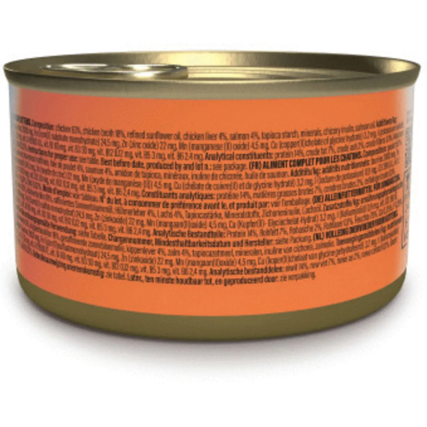| Samenstelling | kip 63%, kippenbouillon 18%, geraffineerde zonnebloemolie, kippenlever 4%, zalm 4%, tapiocazetmeel, mineralen, cichorei-inuline, zalmolie. |