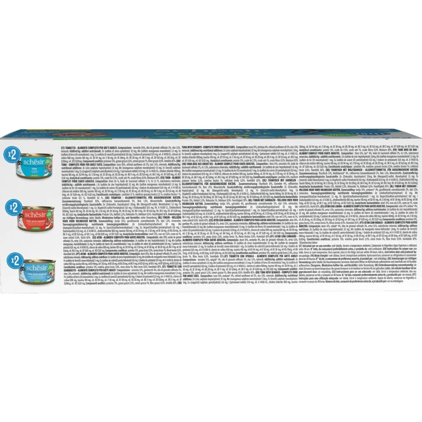 | Samenstelling | Tonijn 51%, Garnalen 4%, Geraffineerde zonnebloemolie 2%, Rijst 1.5%, Mineralen. Tunijn 51%, Zeebrasem 4%, Geraffineerde zonnebloemolie 2%, Rijst 1.5%, Mineralen. Tonijn 55%, Geraffineerde zonnebloemolie 2%, Rijst 1.5%, Mineralen. |