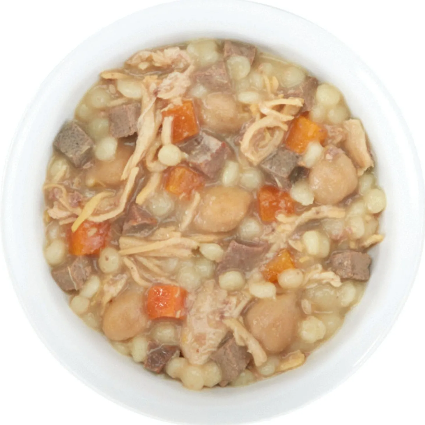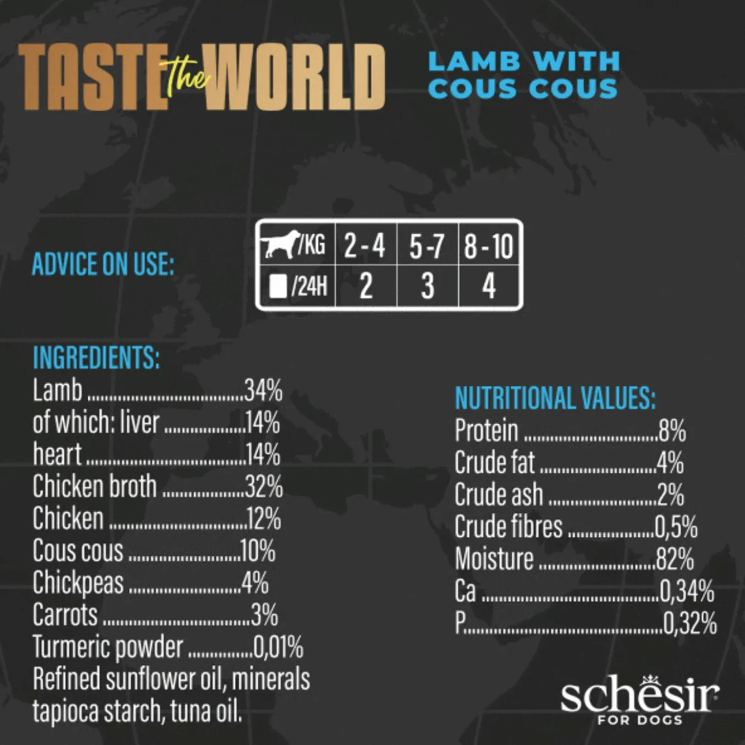 | Samenstelling | lamsvlees 34% (lever 14%, hart 14%), kippenbouillon 32%, kip 12%, couscous 10%, kikkererwten 4%, wortelen 3%, mineralen, geraffineerde zonnebloemolie, tapiocazetmeel, kurkumapoeder 0,1%, tonijnolie. |