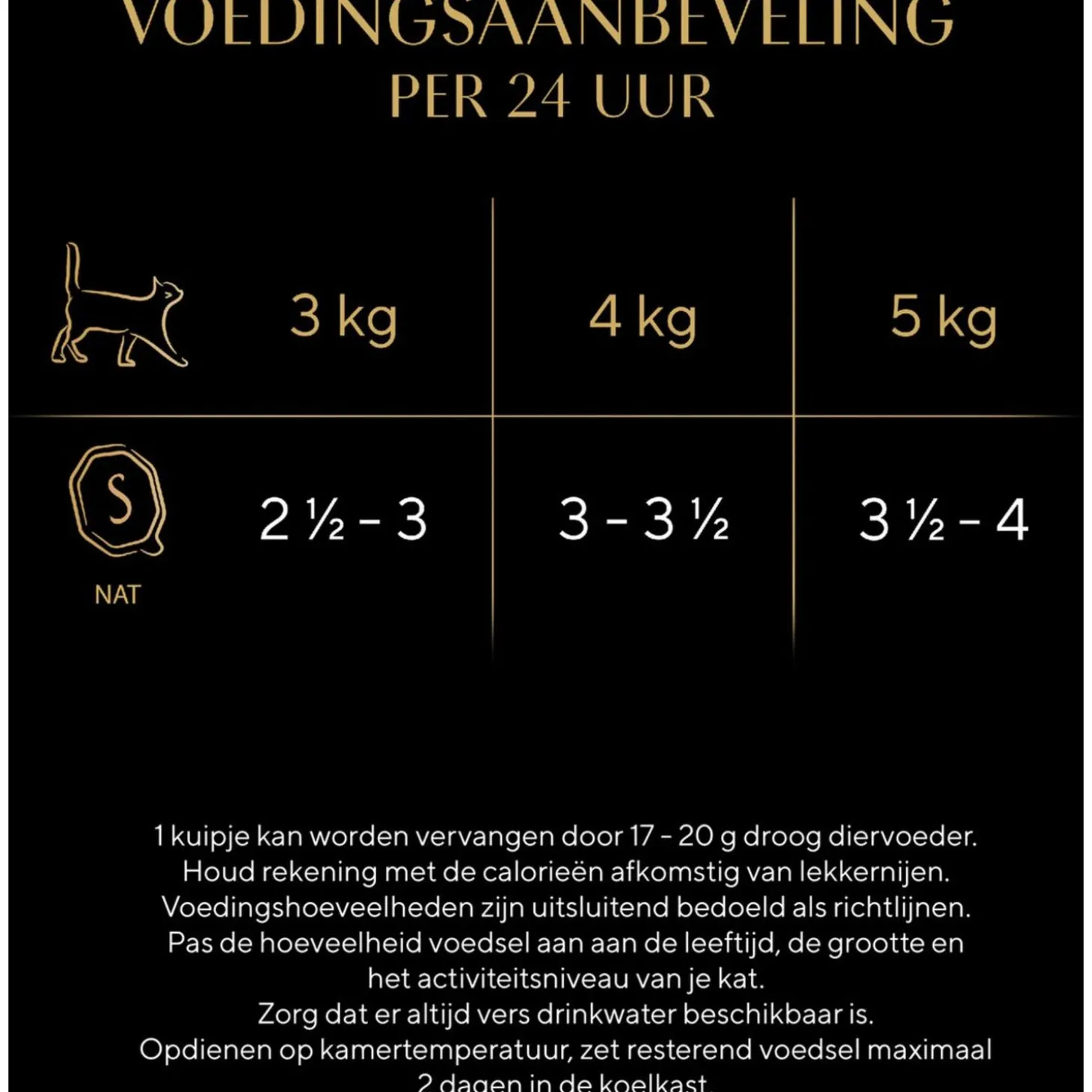 | Aanbeveling | 1 kuipje kan worden vervangen door 17 – 20 g droog diervoeder. Voedingsadvies: Houd rekening met de calorieën afkomstig van lekkernijen. Voedingshoeveelheden zijn uitsluitend bedoeld als richtlijnen. Pas de hoeveelheid voedsel aan aan de leeftijd, de grootte en het activiteitsniveau van je kat. Zorg dat er altijd vers drinkwater beschikbaar is. Opdienen op kamertemperatuur, De behoeften van uw huisdier wat betreft voeding zullen verschillen overeenkomstig leeftijd, gewicht, geslacht, ras en activiteit. Aangezien het belangrijk is dat uw huisdier de juiste hoeveelheid voeding krijgt, raadpleeg het etiket/verpakking voor het complete, gedetailleerde voedingsadvies. |