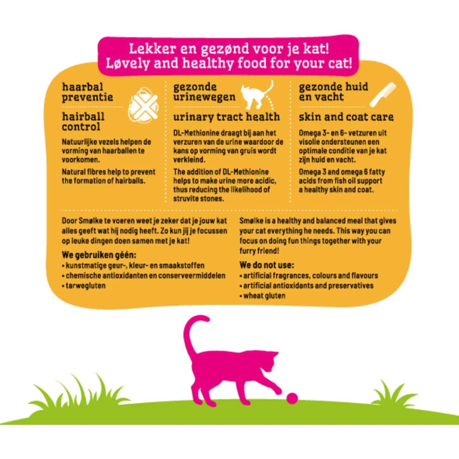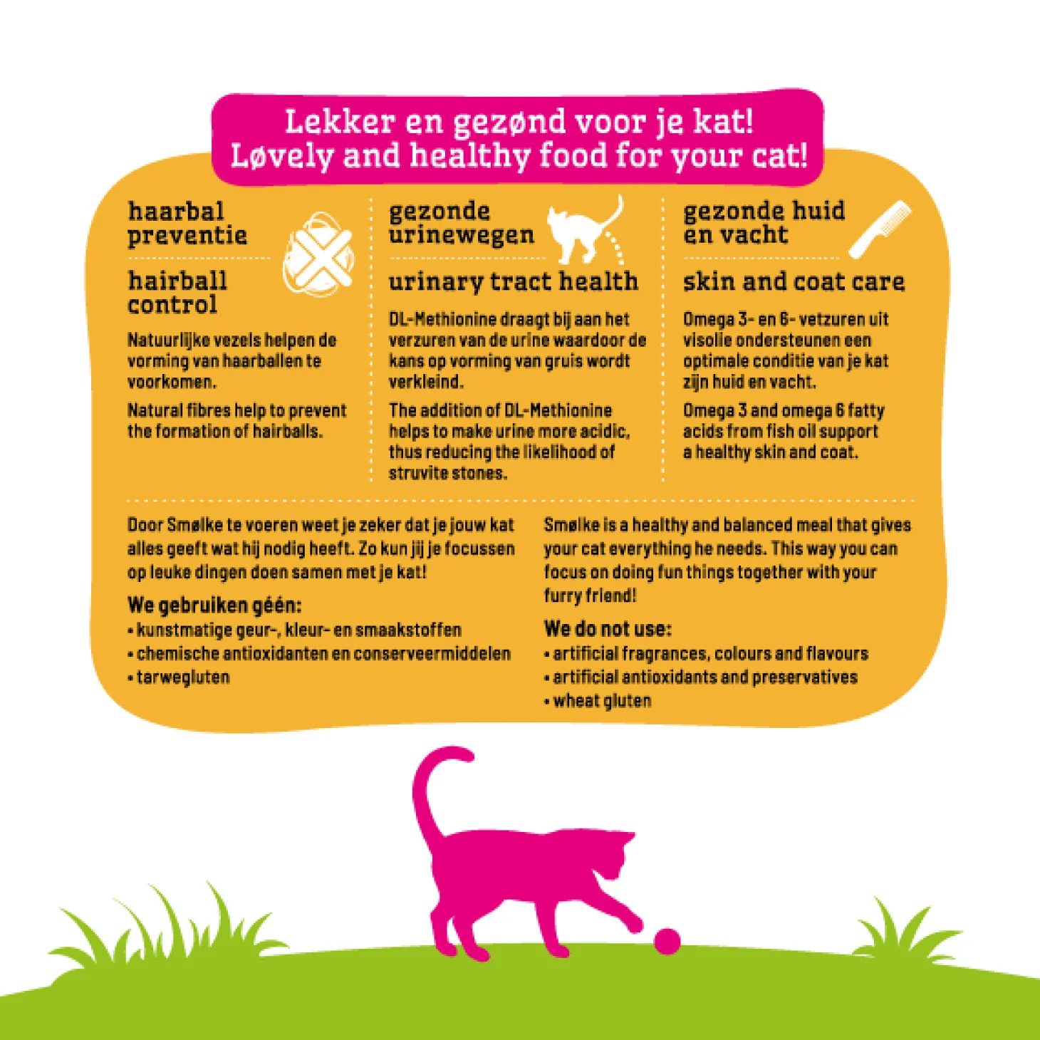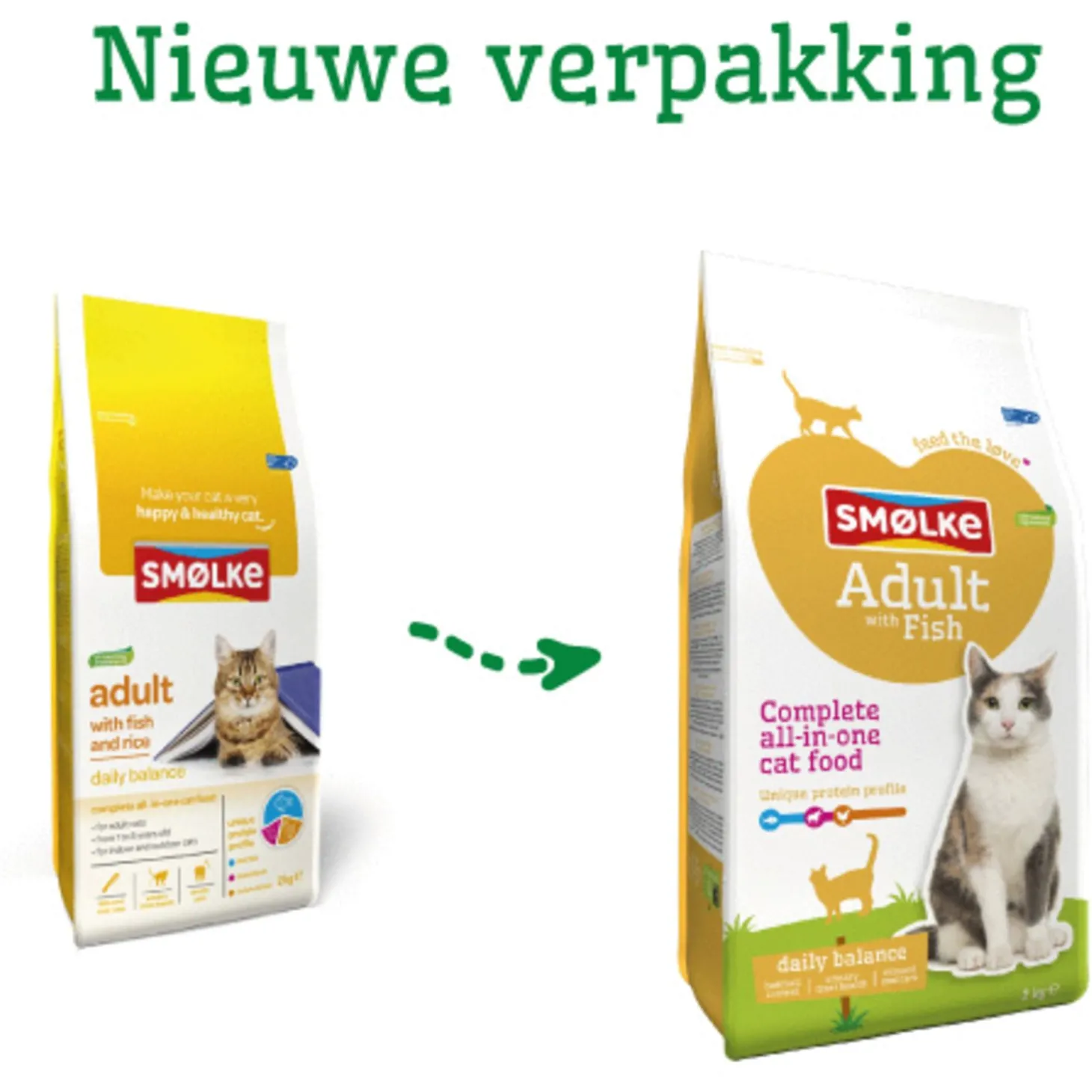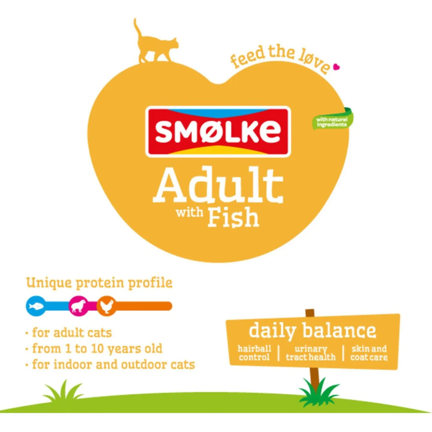 Een complete kattenvoeding met natuurlijke ingrediënten wat elke dag weer zorgt voor een blije en tevreden kat, dat is Adult Fish and Rice kattenvoeding van Smølke. Deze brokjes bevatten alles wat je kat nodig heeft om iedere dag in balans te zijn. Het voer is geschikt voor volwassen katten vanaf 1 jaar tot 8 jaar oud.