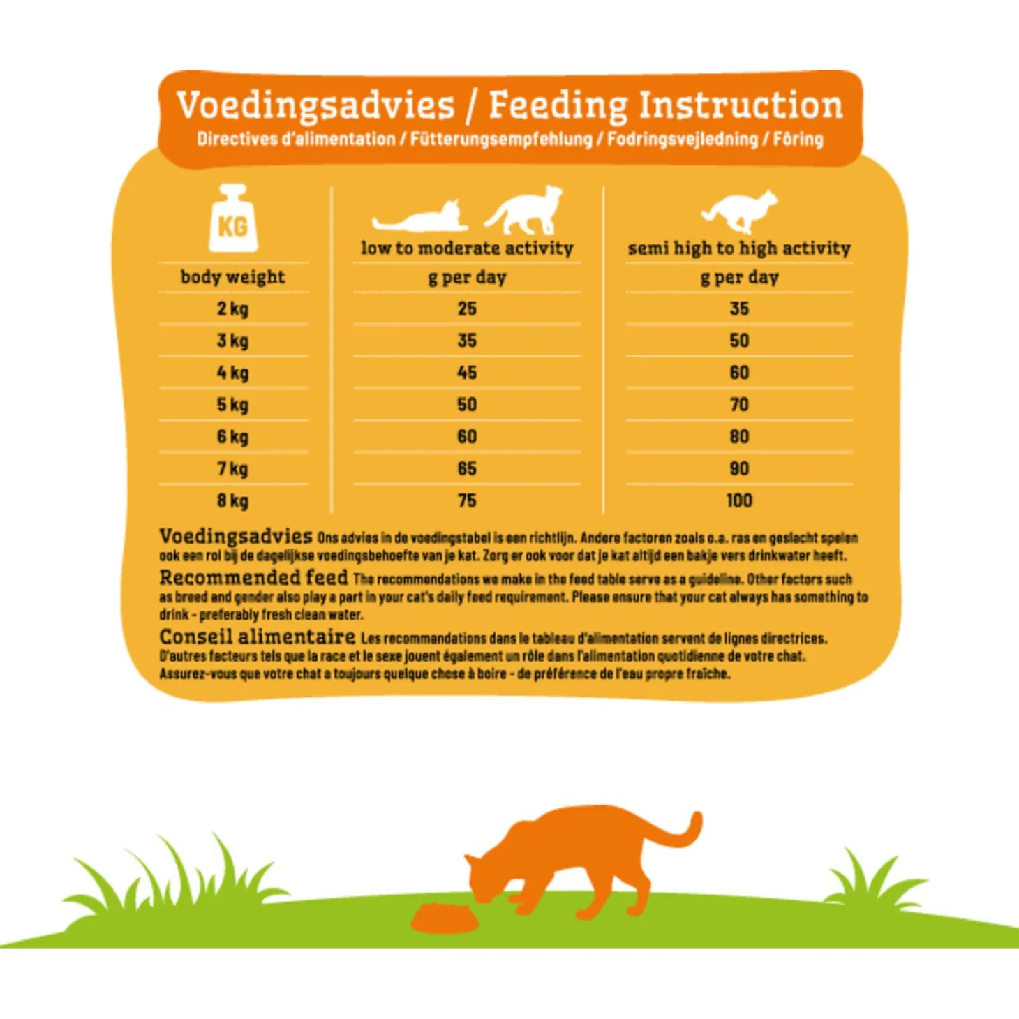 | Aanbeveling | Zie voedingstabel op de verpakking. Ons advies in de voedingstabel is een richtlijn. Andere factoren zoals o.a. ras en geslacht spelen ook een rol bij de dagelijkse voedingsbehoefte van je kat. Zorg er ook voor dat je kat altijd een bakje vers drinkwater heeft.||Bitte füttern vor dem angegebenen Haltbarkeitsdatum. Nach dem Öffnen bitte die Verpackung wieder verschließen. Kühl und trocken lagern. ||Nous recommandons de servir les croquettes à votre chat avant la date de péremption indiquée. Refermez soigneusement l’emballage après l’ouverture et conservez toujours l’alimentation dans un endroit frais et sec. Les croquettes resteront ainsi savoureuses et fraîches !||We recommend serving the kibbles to your cat prior to the indicated expiration date. Carefully re-close the packaging once it has been opened and always store food in a cool dry place. This will keep the kibbles tasty & fresh!||Vi anbefaler, at du fodrer din hund maden før den angivne anvendelsesdato. Zoom genlukke emballagen efter åbning. Opbevar altid maden på et køligt og tørt sted.||Vi rekommenderar att du matar din hund innan den angivna förbrukningsdatum. Stäng paketet igen efter öppnandet. Förvara alltid mat i en sval och torr plats. |