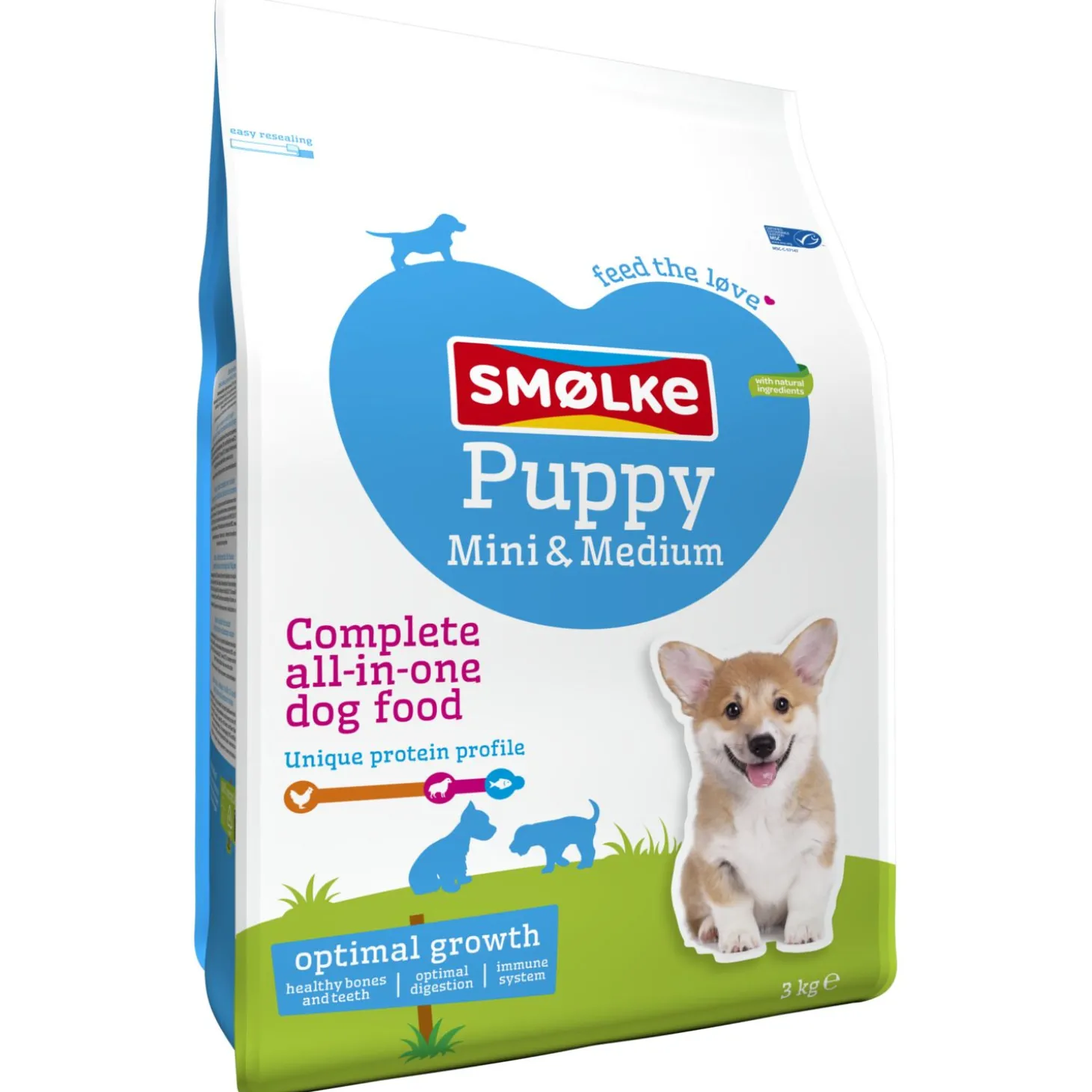 Een complete puppyvoeding met natuurlijke ingrediënten wat elke dag weer zorgt voor een blije en tevreden hond, dat is Puppy Mini-Medium hondenvoeding van Smølke. Dit hondenvoer voor je kleine tot middelgrote puppy (lichter dan 30 kg wanneer volwassen) bevat alles wat hij nodig heeft om iedere dag in balans te zijn. Het voer is geschikt voor puppy’s tot 10 à 12 maanden oud.