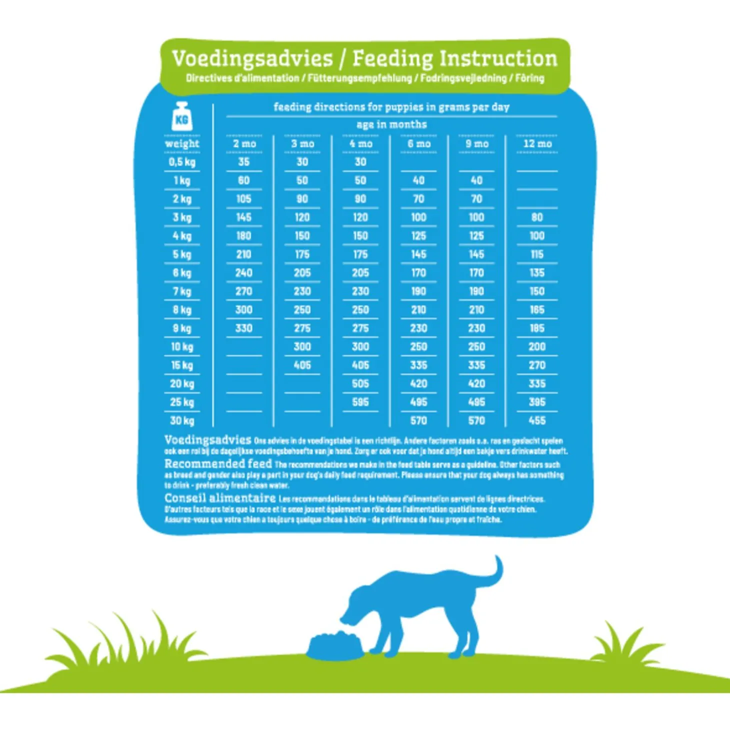 | Aanbeveling | Zie voedingstabel op de verpakking. Ons advies in de voedingstabel is een richtlijn. Andere factoren zoals o.a. ras en geslacht spelen ook een rol bij de dagelijkse voedingsbehoefte van je hond. Zorg er ook voor dat je hond altijd een bakje vers drinkwater heeft.||Die Empfehlung in der Tabelle ist ein Richtlinie. Der genaue Bedarf hängt von verschiedenen Faktoren ab, wie Geschlecht und Rasse. Bitte immer frisches Trinkwasser bereitstellen.||Les recommandations dans le tableau d’alimentation servent de lignes directrices. D’autres facteurs tels que la race et le sexe jouent également un rôle dans l’alimentation quotidienne de votre chat. Assurez-vous que votre chat a toujours quelque chose à boire – de préférence de l’eau propre fraîche.||The recommendations we make in the feed table serve as a guideline. Other factors such as breed and gender also play a part in your dog’s daily feed requirement. Please ensure that your dog always has something to drink — preferably fresh clean water.||Anbefalingerne i foderet tabel kan tjene som en rettesnor. Andre faktorer som race og køn spiller også en rolle i din kats daglige ernæringsbehov. Sørg for, at din kat altid har noget at drikke – helst frisk rent vand.||De rekommendationer i fodertabellen fungera som en riktlinje. Andra faktorer såsom ras och kön spelar också en roll i din katts dagliga foderbehov. Se till att din katt har alltid något att dricka – helst färskt rent vatten. |
