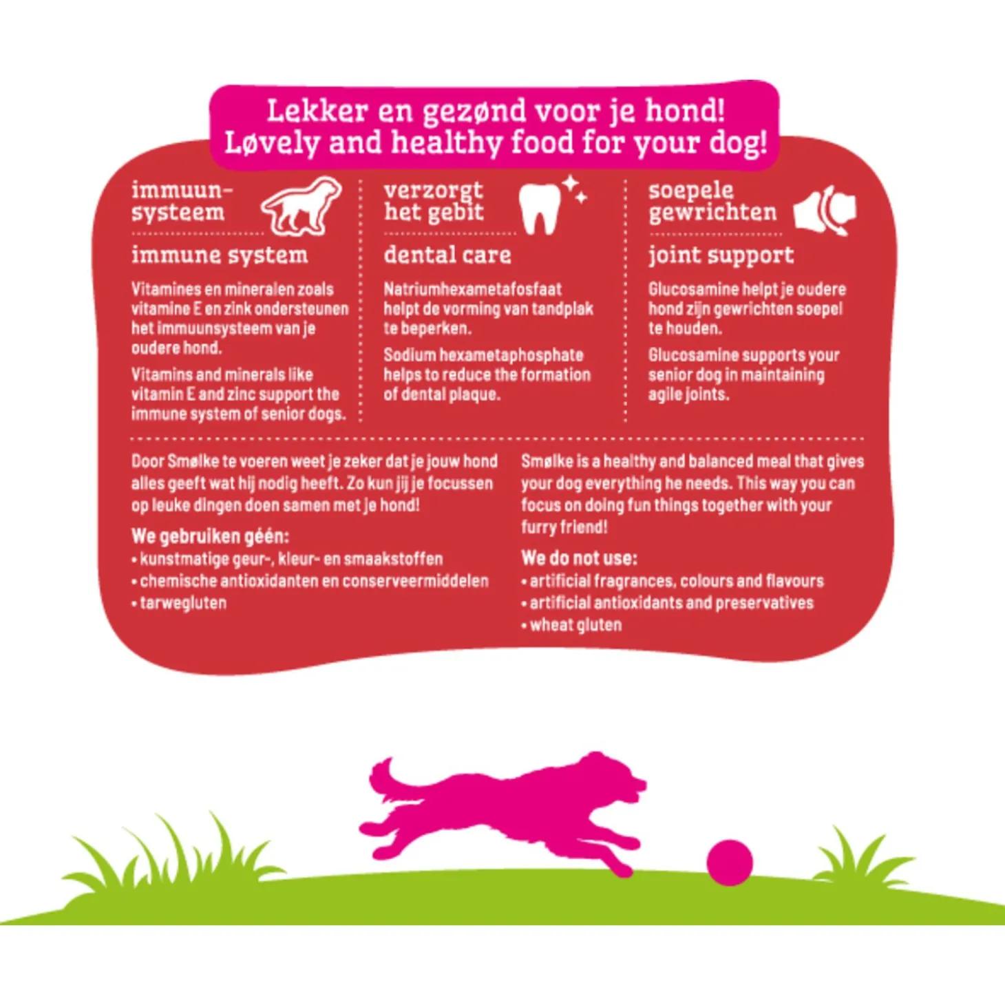 Senior Mini bevat geen tarwegluten en is zeer goed verteerbaar. Het voer is bereid met Nederlandse kip, MSC vis en Britse lam. Deze unieke combinatie van lokale en duurzame ingrediënten zorgt voor een compleet aanbod aan bouwstoffen, afgestemd op de specifieke behoefte van je trouwe viervoeter. Ook bevat het voer geen kunstmatige geur-, kleur- en smaakstoffen of chemische antioxidanten.