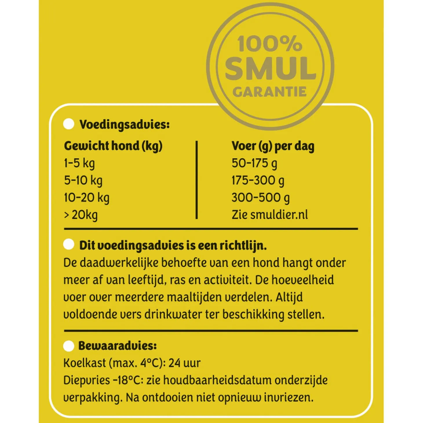 Smuldier Vers Vlees Brokjes Kip met Groenten is een complete dieetvoeding voor volwassen honden. De brokjes zijn gemaakt van vers kippenvlees, kippenkarkas en groenten. Dit zorgt voor een smakelijke en voedzame maaltijd die je hond de juiste energie geeft.