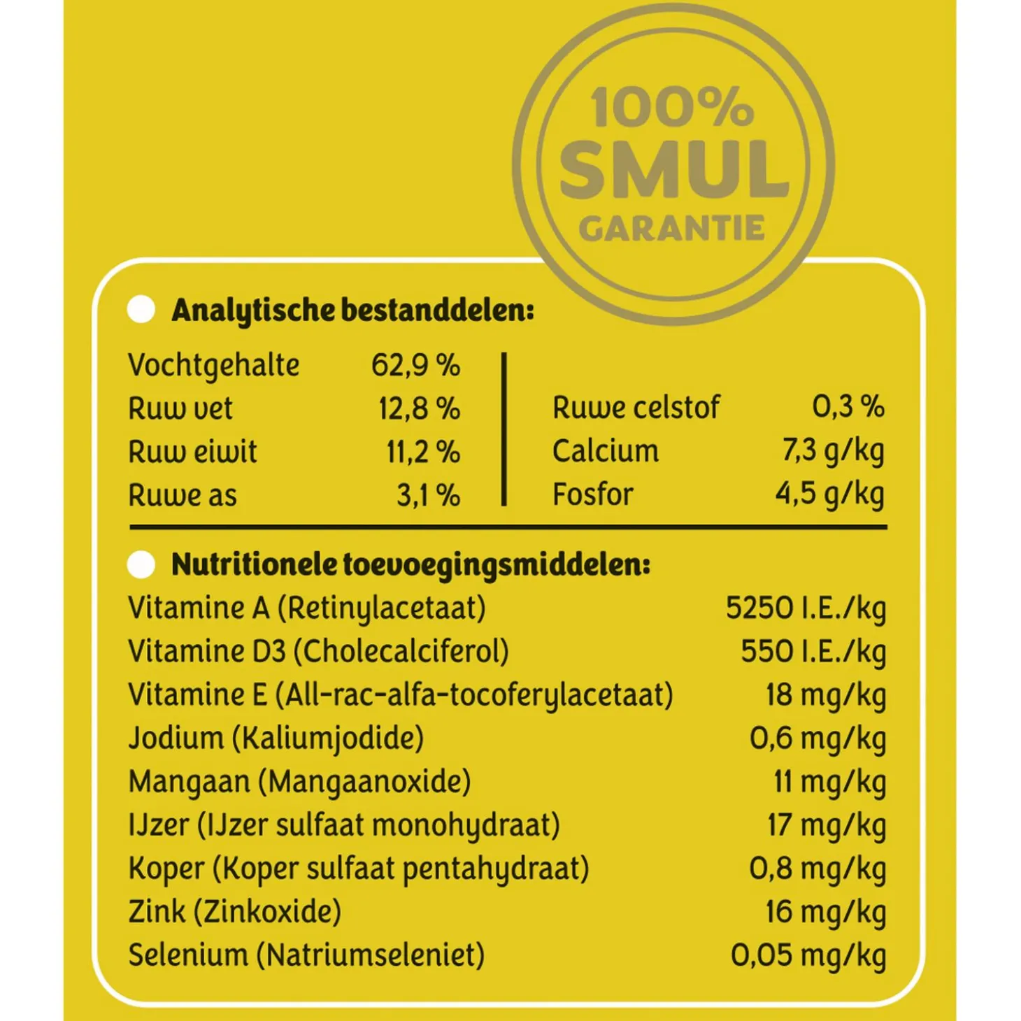 Smuldier Vers Vlees Brokjes Kip met Groenten heeft een vochtgehalte van 62,9%. Dit maakt de brokjes licht verteerbaar en zorgt ervoor dat ze snel opwarmen. De brokjes bevatten daarnaast de volgende voedingswaarden: