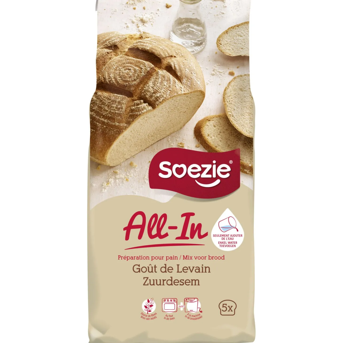 Kneed 500g All-in-mix met 310ml water tot een soepel deeg (ca. 20 min.). Bedek met plastic en laat 30 à 40 min. rijzen. Druk het deeg plat en geef het de gewenste vorm. Leg het in een ingevette bakvorm. Laat 40 min rijzen onder plastic. Bak 30 à 35 min. in een voorverwarmde over op 220°C.