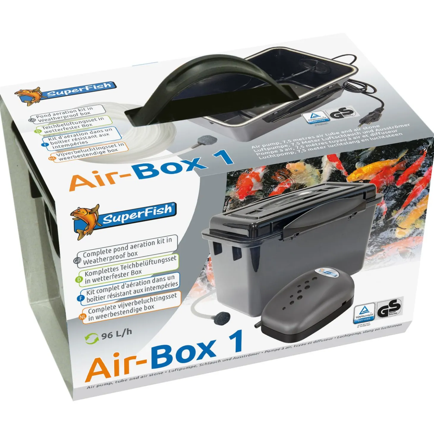 In de vijver leven verschillende soorten dieren waaronder goudvissen en koikarpers. Om deze dieren goed te kunnen houden is het essentieel dat er voldoende zuurstof in de vijver komt en dat kan op verschillende manieren, zoals met de Air-Box 1. De Air-Box 1 van Superfish is een complete beluchtingsset van een vermogen van 4 Watt en een pompcapaciteit van 240 l/u. De set komt in een handige box voor bescherming tegen regen en spatwater.